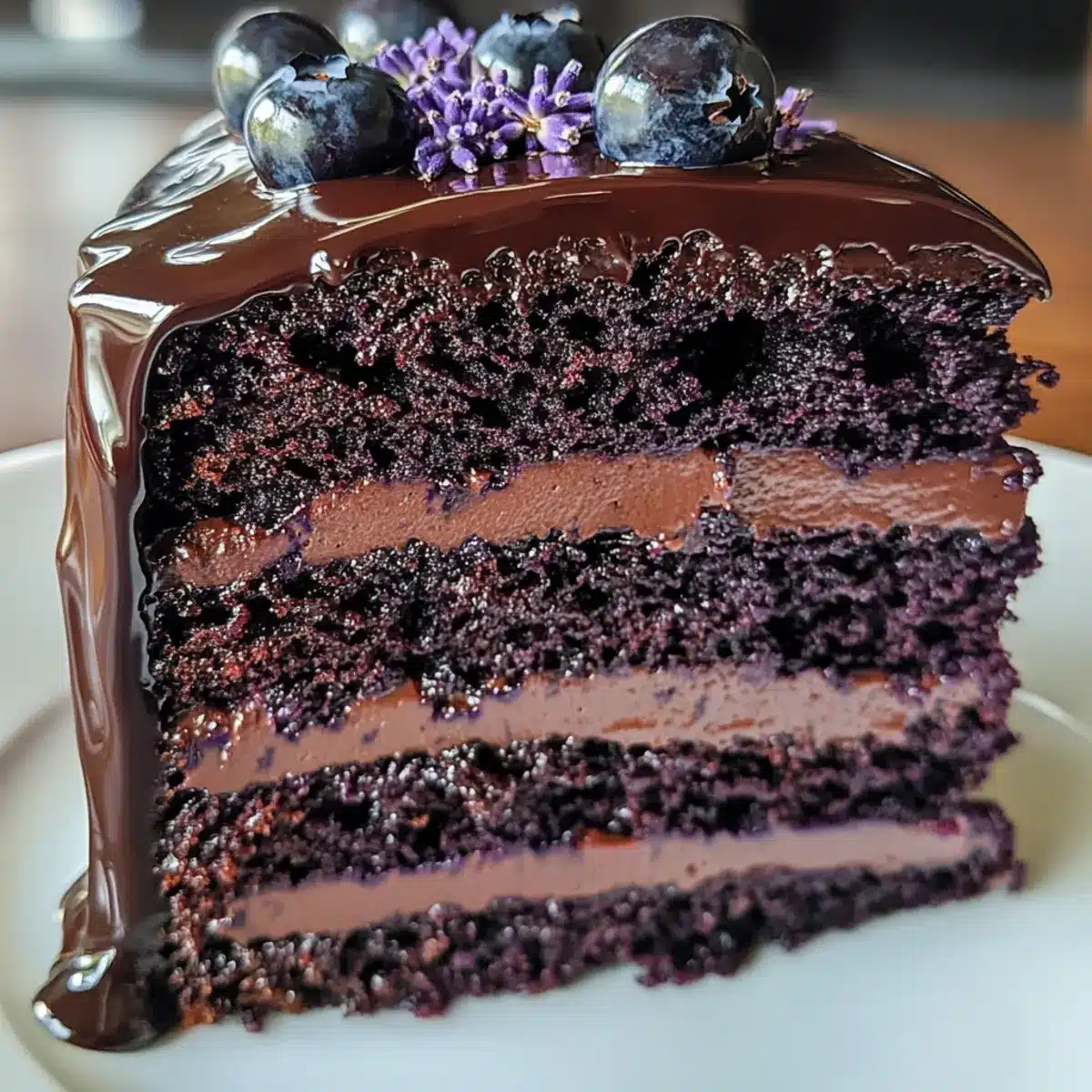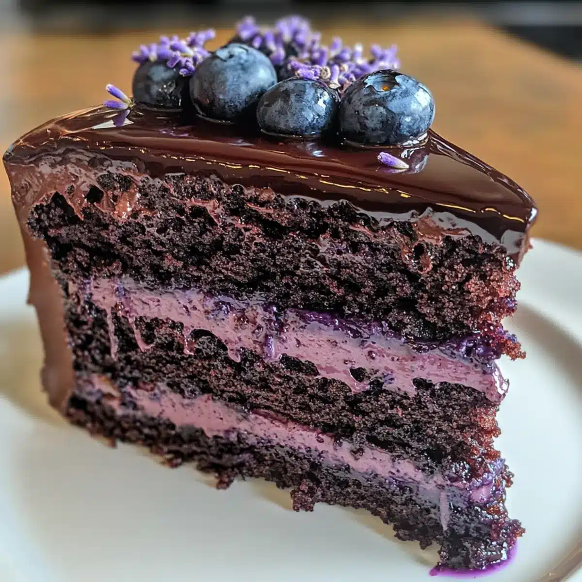 Once the cake layers are completely cool, it’s time to assemble your Blueberry Chocolate Lavender Dream Cake. Place the first layer on a serving plate, spreading a layer of blueberry compote on top. Add the second layer and repeat the process. Finish by pouring the silky lavender ganache over the top layer, allowing it to cascade down the sides beautifully.