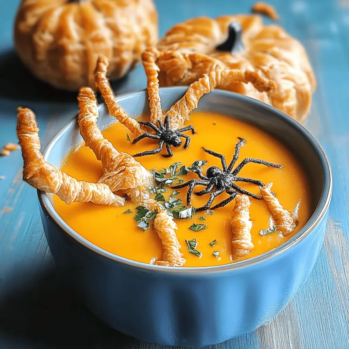 Delicious Pumpkin Soup for Halloween with Bloody Spiders
