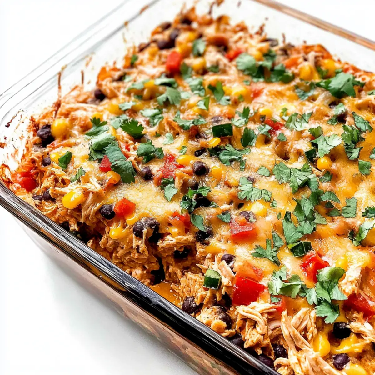 Next, add the shredded chicken, drained black beans, and frozen corn to the casserole. Gently fold everything together until it is well mixed, ensuring the chicken and beans are evenly distributed. As you stir, the colors meld beautifully, and the rich scents fill the air, giving you a taste of what’s to come.