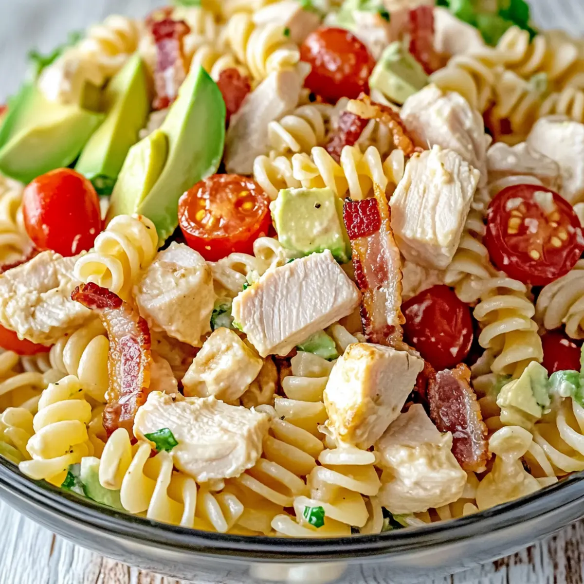 For the best flavor, cover the bowl with plastic wrap and chill the Chicken Club Pasta Salad in the refrigerator for at least 30 minutes. This allows the flavors to meld beautifully while the salad gets refreshingly cool. Just before serving, give it a gentle stir to redistribute the dressing and add the avocado for a final fresh touch.