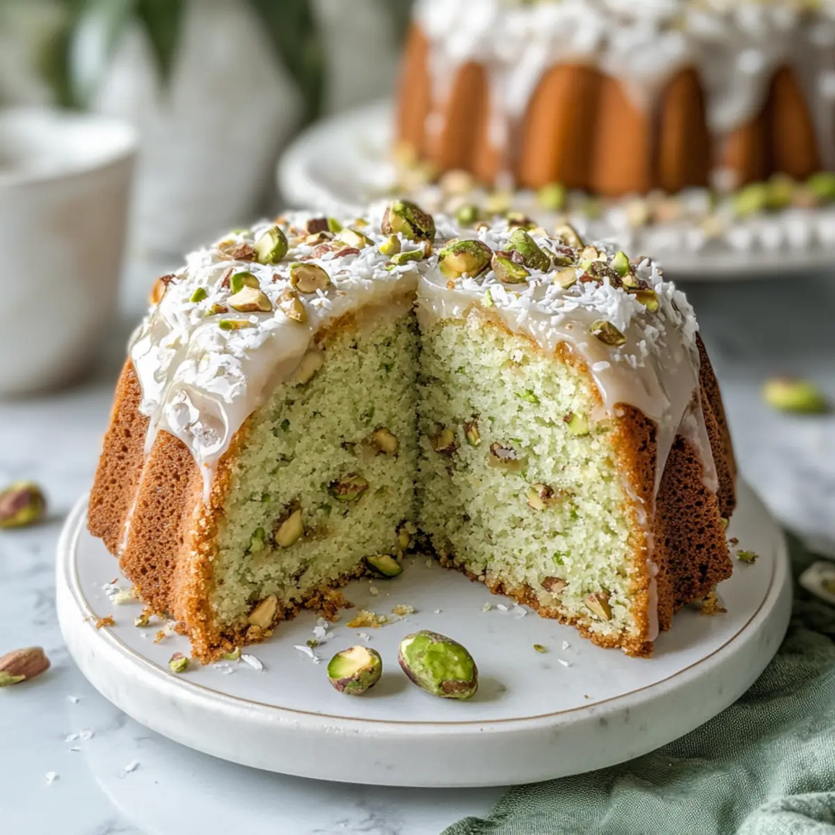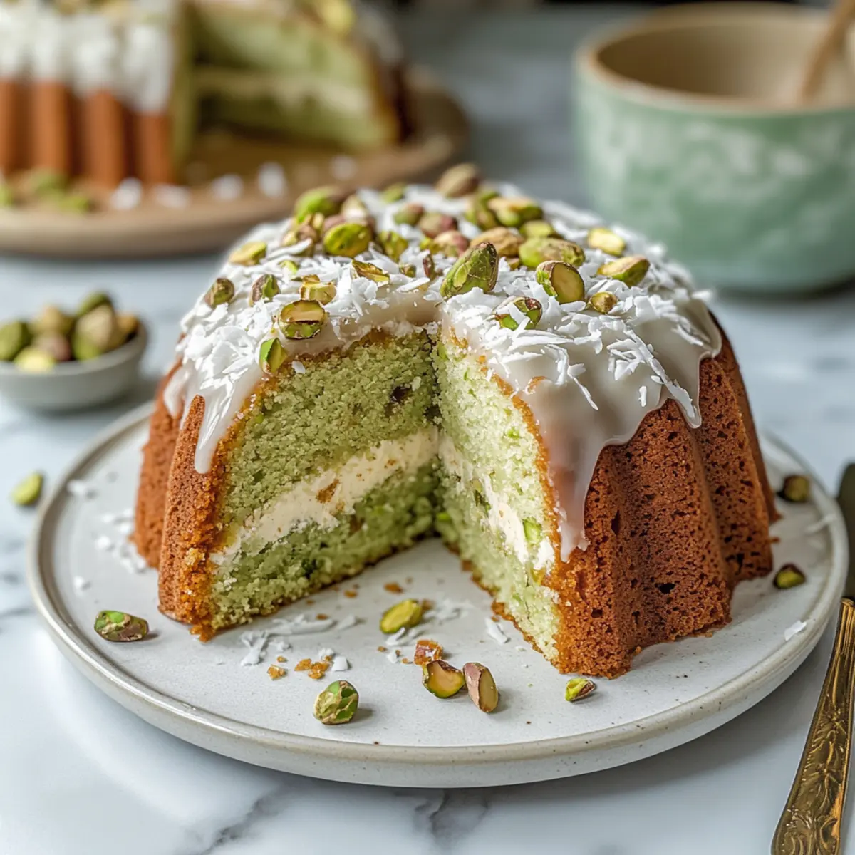 The Coconut and Pistachio Pudding Cake is a fantastic option for meal prep, making life easier for busy home cooks! You can prepare the cake batter up to 24 hours in advance by mixing all the dry and wet ingredients and storing it in an airtight container in the refrigerator. Additionally, you can bake the cake ahead of time, allowing it to cool completely before wrapping it tightly in plastic wrap, which allows the flavors to meld beautifully while keeping it fresh for up to 3 days at room temperature. When ready to serve, simply drizzle the coconut glaze over the cake and garnish with toasted coconut and pistachios. This way, you’ll enjoy a delightful dessert with minimal effort on the day of your gathering!