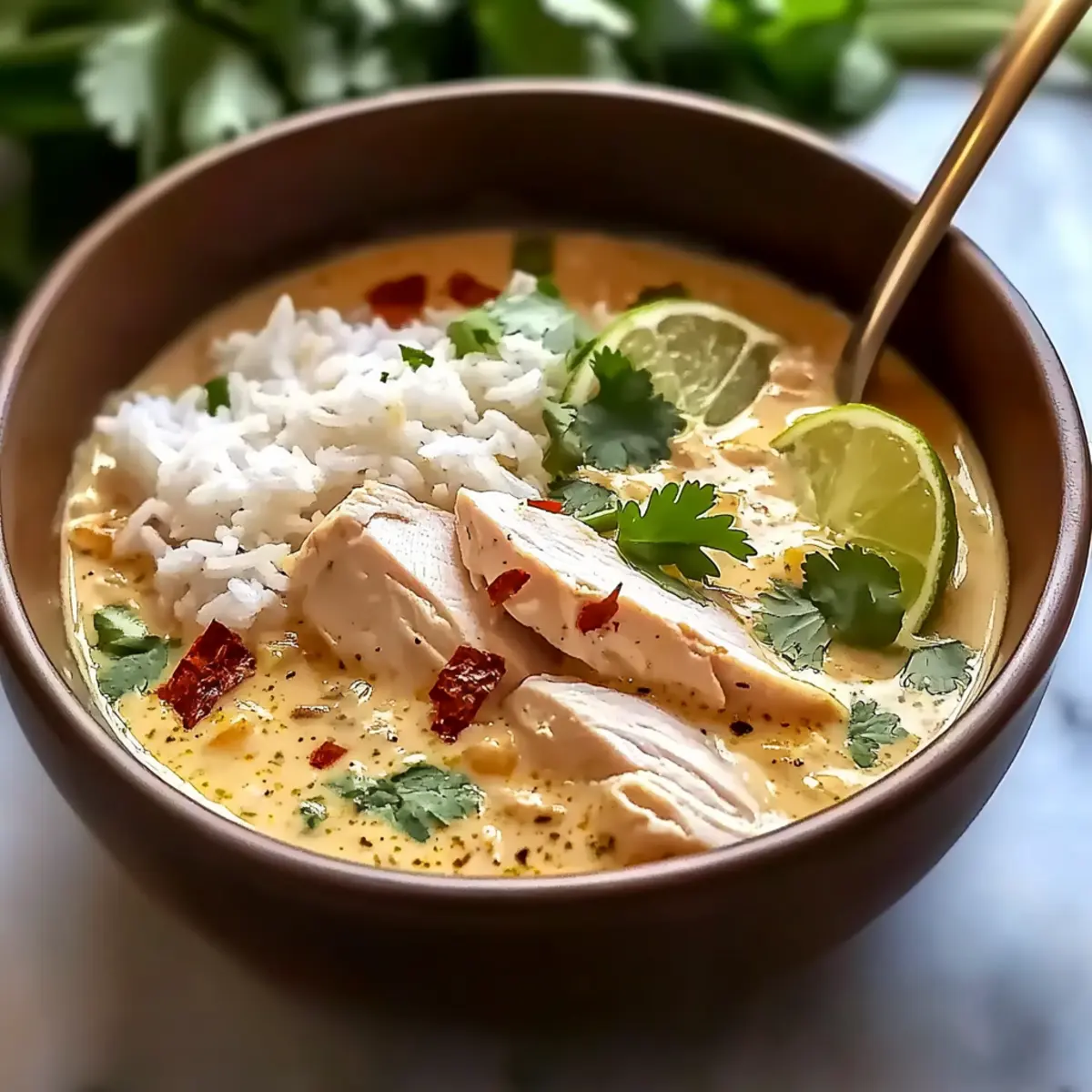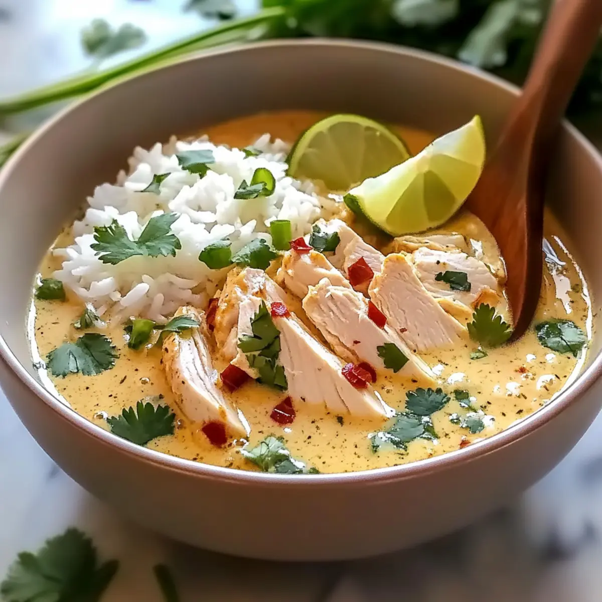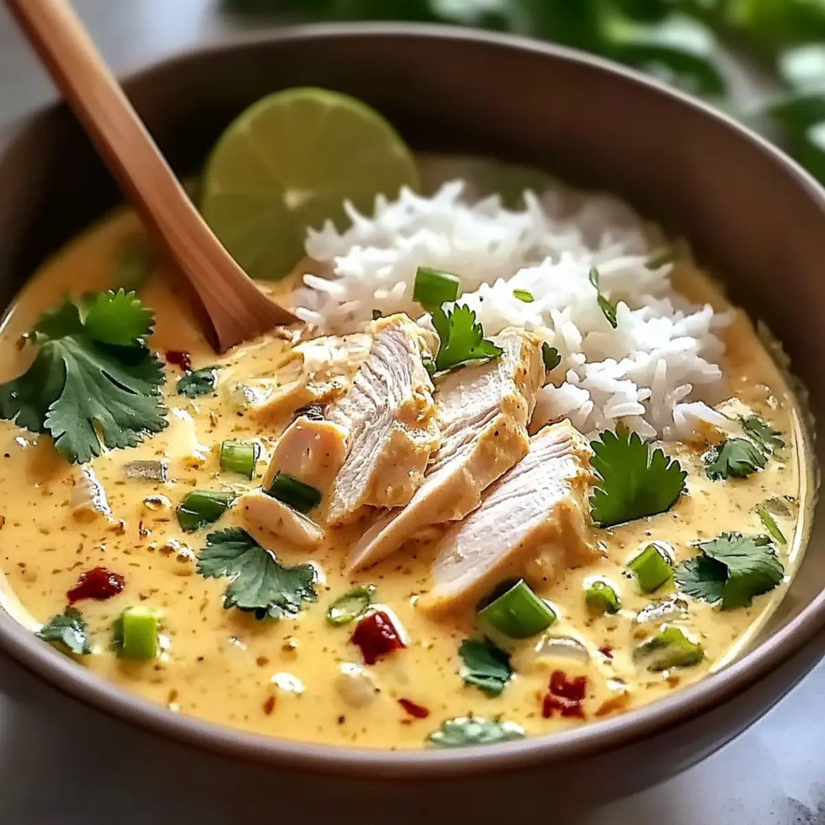 Once the chicken is cooked, remove it from the pot, slice it, and set it aside. Serve jasmine rice in bowls, ladling over the creamy broth with chicken pieces on top. Garnish generously with thinly sliced green onions, fresh cilantro, and lime wedges for a burst of flavor, creating a vibrant finish to your delightful Coconut Chicken Brothy Rice.