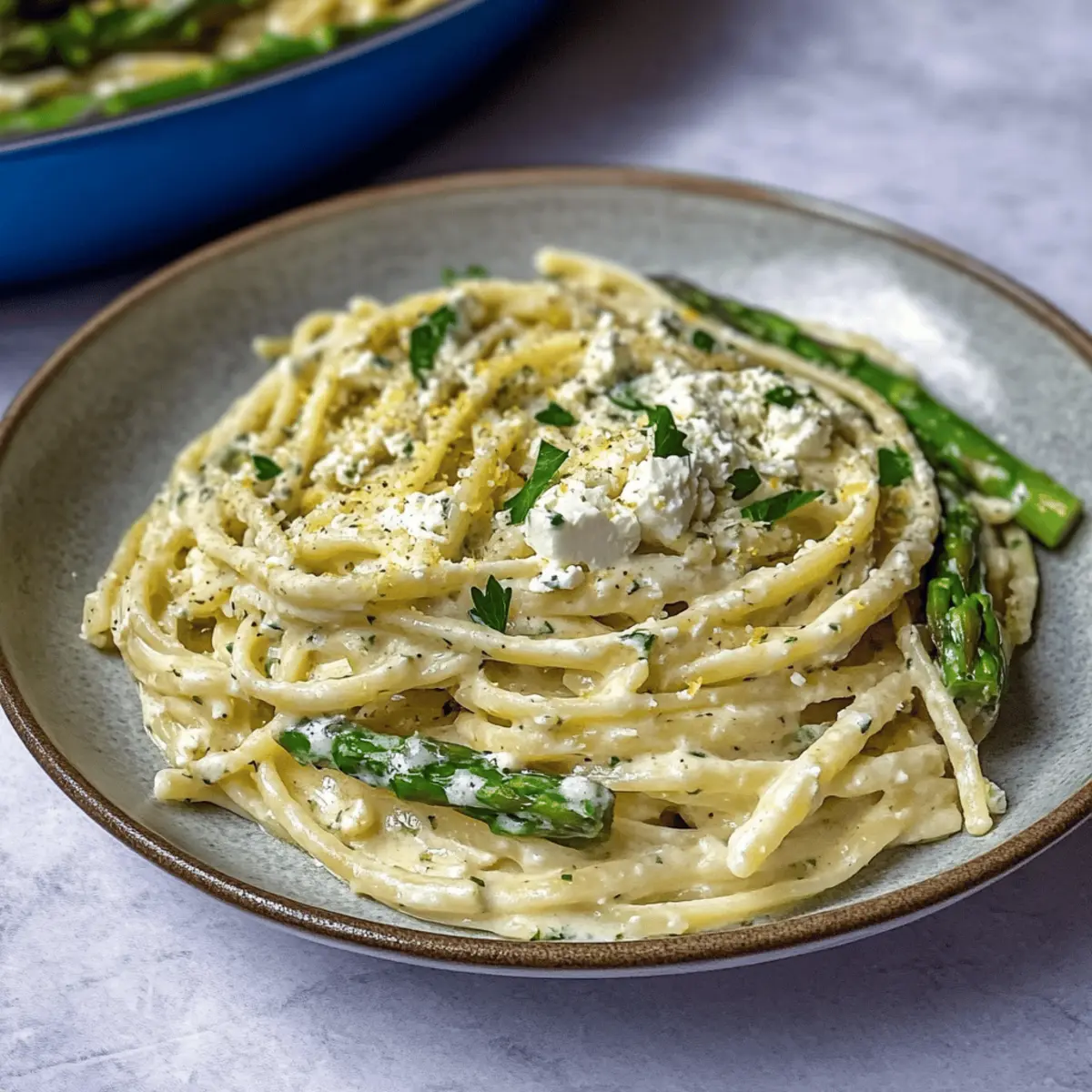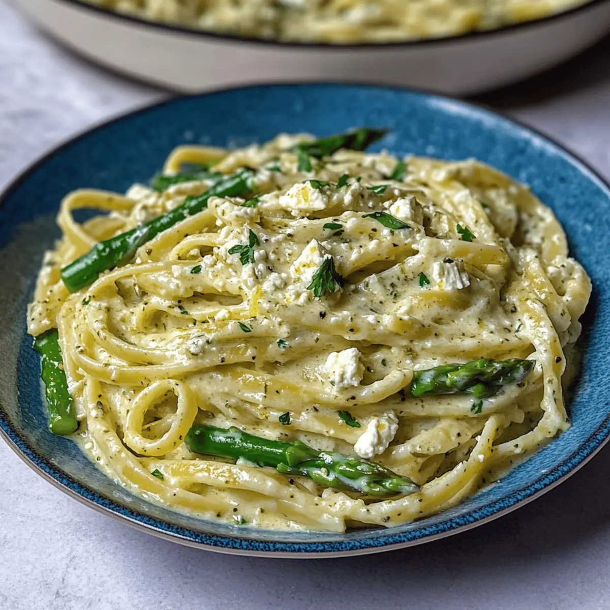 - Add the drained linguine to the creamy sauce in the skillet. Toss well to coat. Remove from heat, and gently fold in the lemon feta sauce and sautéed asparagus, ensuring everything is mixed.