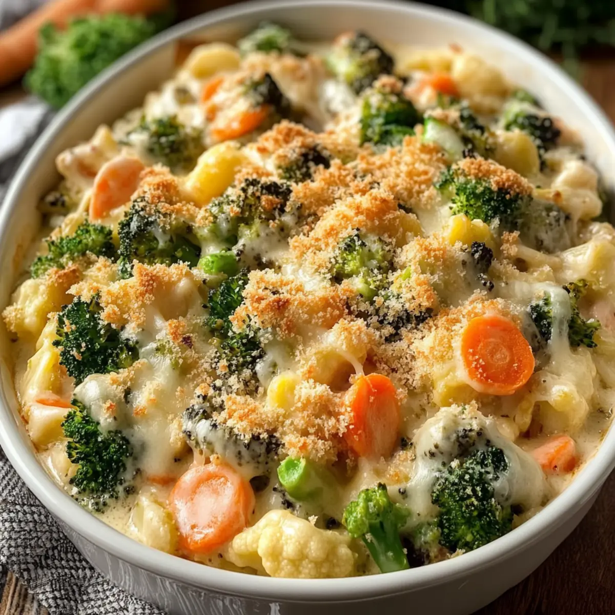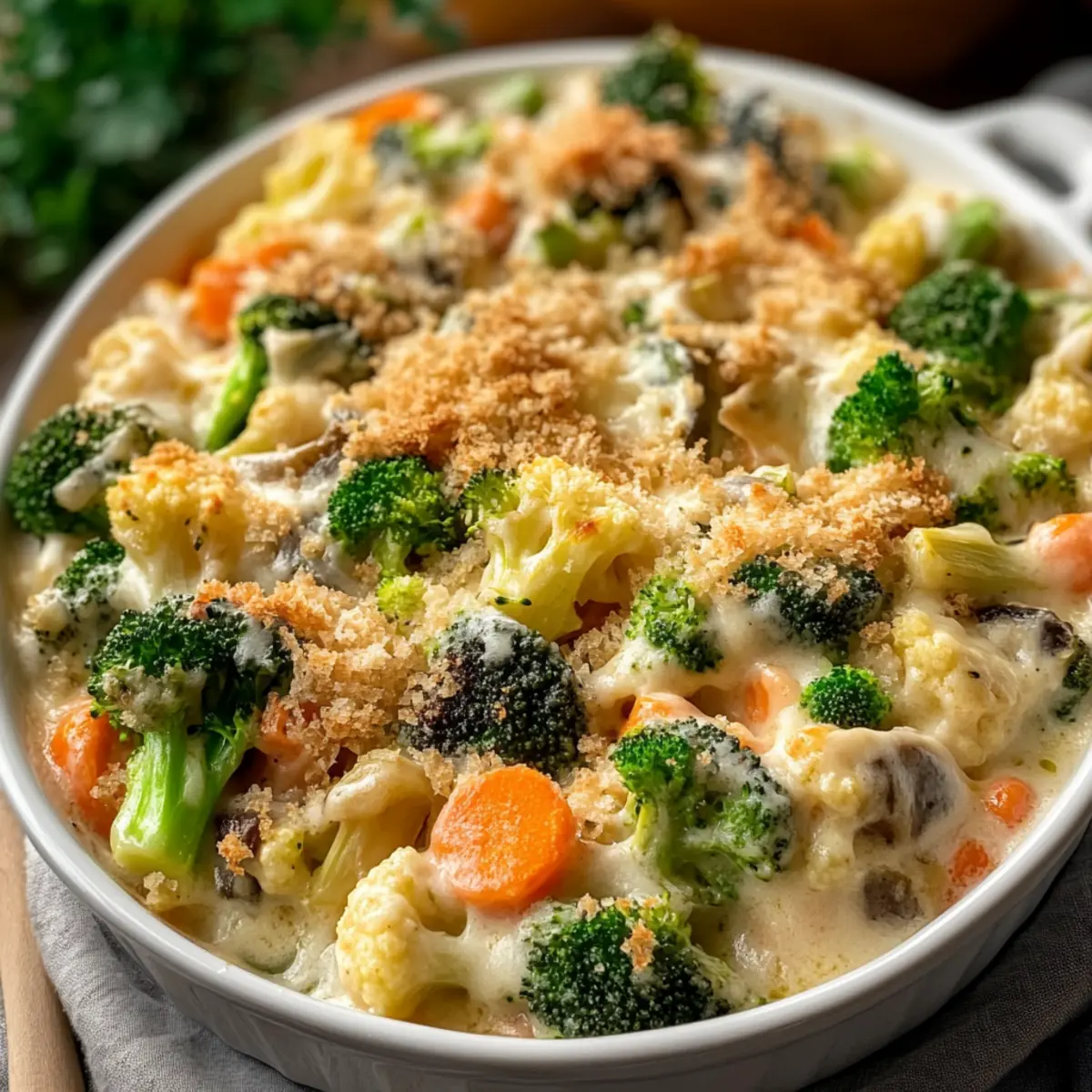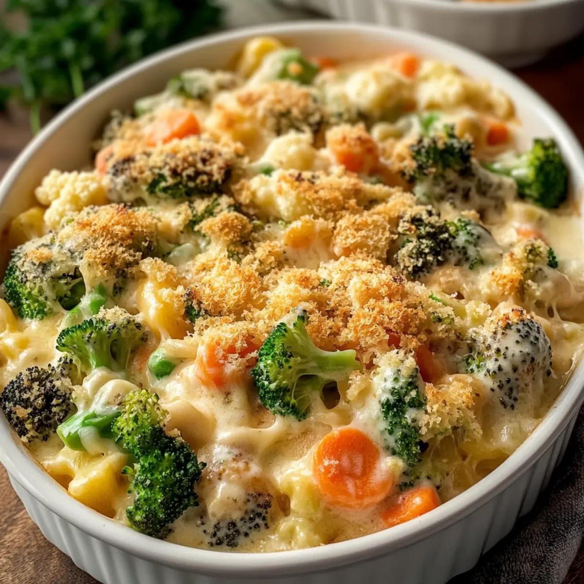 In a small bowl, mix 1 cup of breadcrumbs with ¼ cup of grated Parmesan cheese. Sprinkle the breadcrumb mixture evenly over the casserole. This topping will create a satisfying crunch that contrasts beautifully with the creamy vegetables beneath.