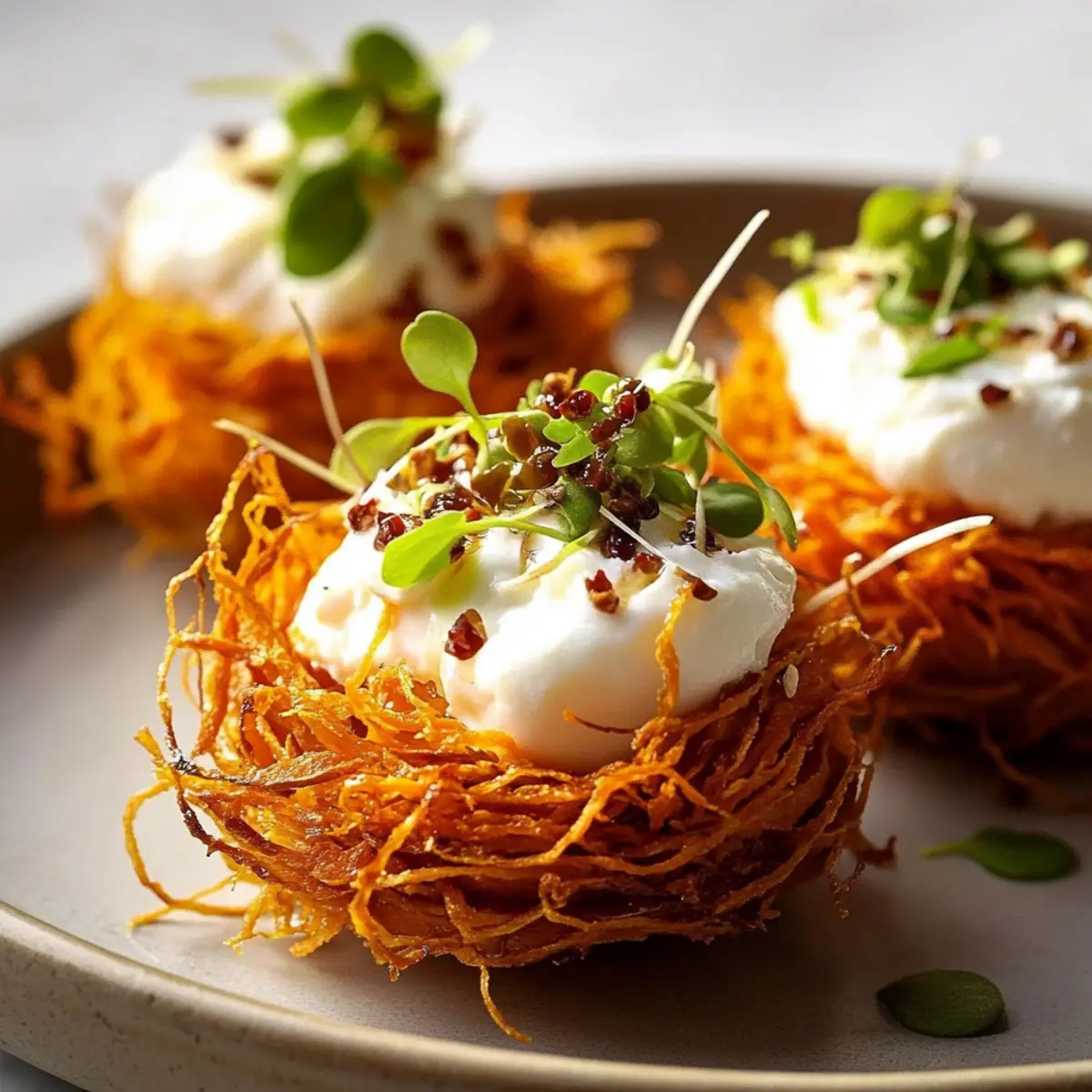 The aroma of roasting sweet potatoes wafted through my kitchen, instantly transporting me to a cozy fall gathering. This is the inspiration behind my Crispy Sweet Potato Nests with Burrata and Chili Honey—a delightful appetizer that strikes the perfect balance between comfort and elegance. Not only do these nests showcase a vibrant pop of color, but they also cater to gluten-free diets, making them ideal for festive occasions or any dinner party where impressing guests is a must. The versatility of this recipe allows for simple adaptations—think creamy vegan cheeses or creative toppings to suit your taste. With a quick prep time and an exciting flavor profile that combines sweetness, creaminess, and a hint of spice, you’ll find it hard to resist making these beautiful nests again and again. Are you ready to elevate your next gathering with this culinary treasure?
