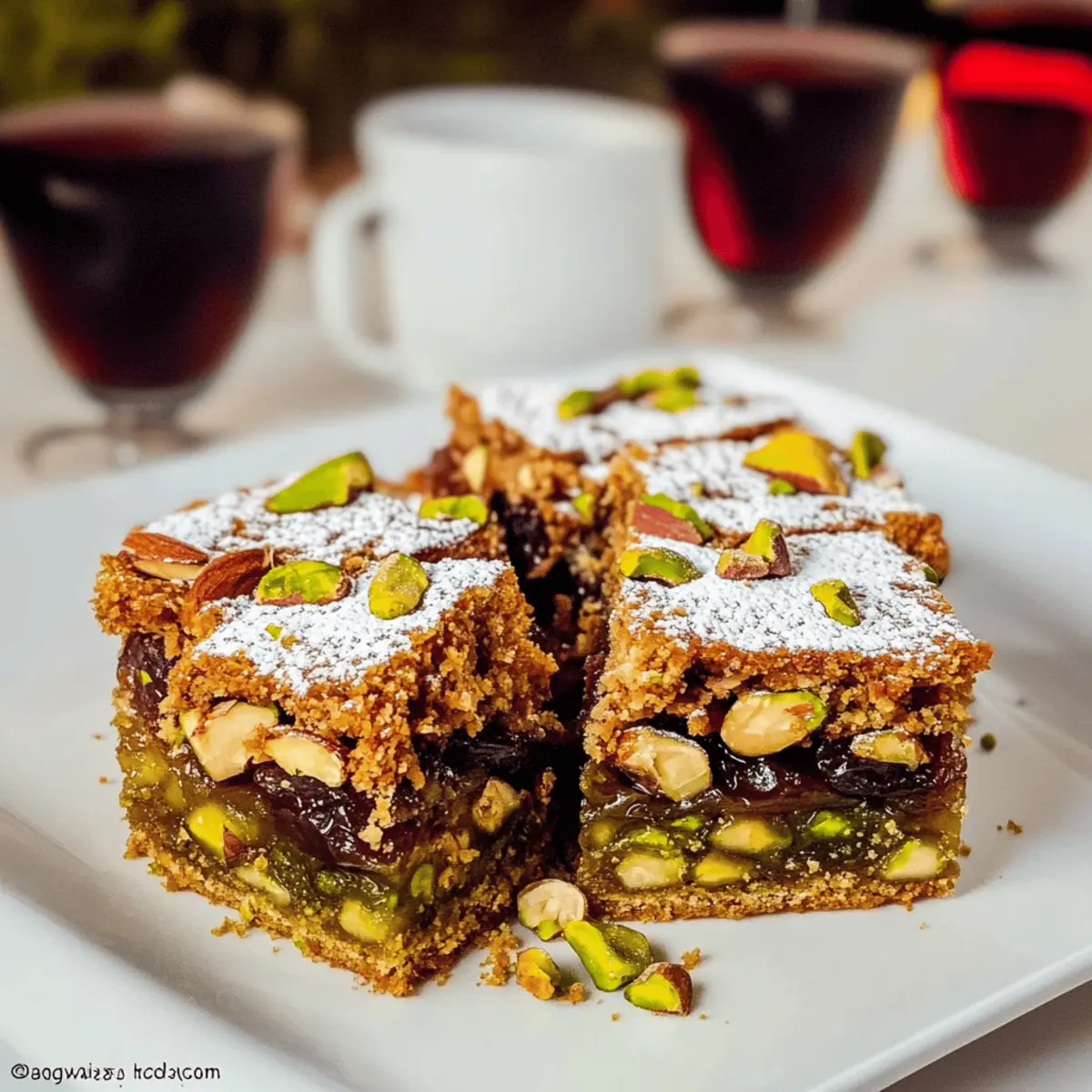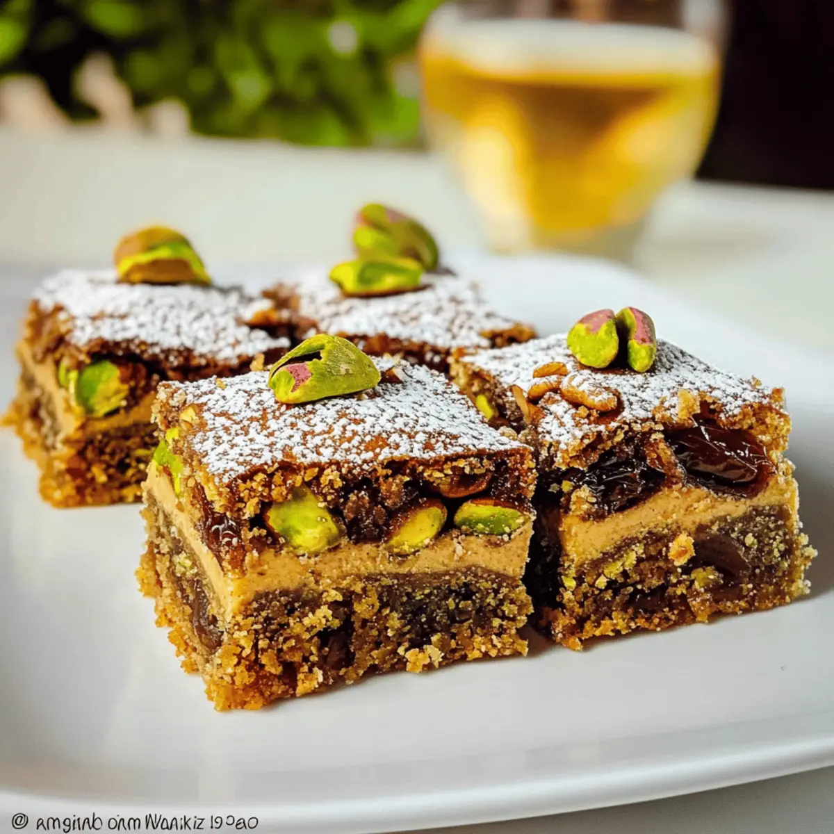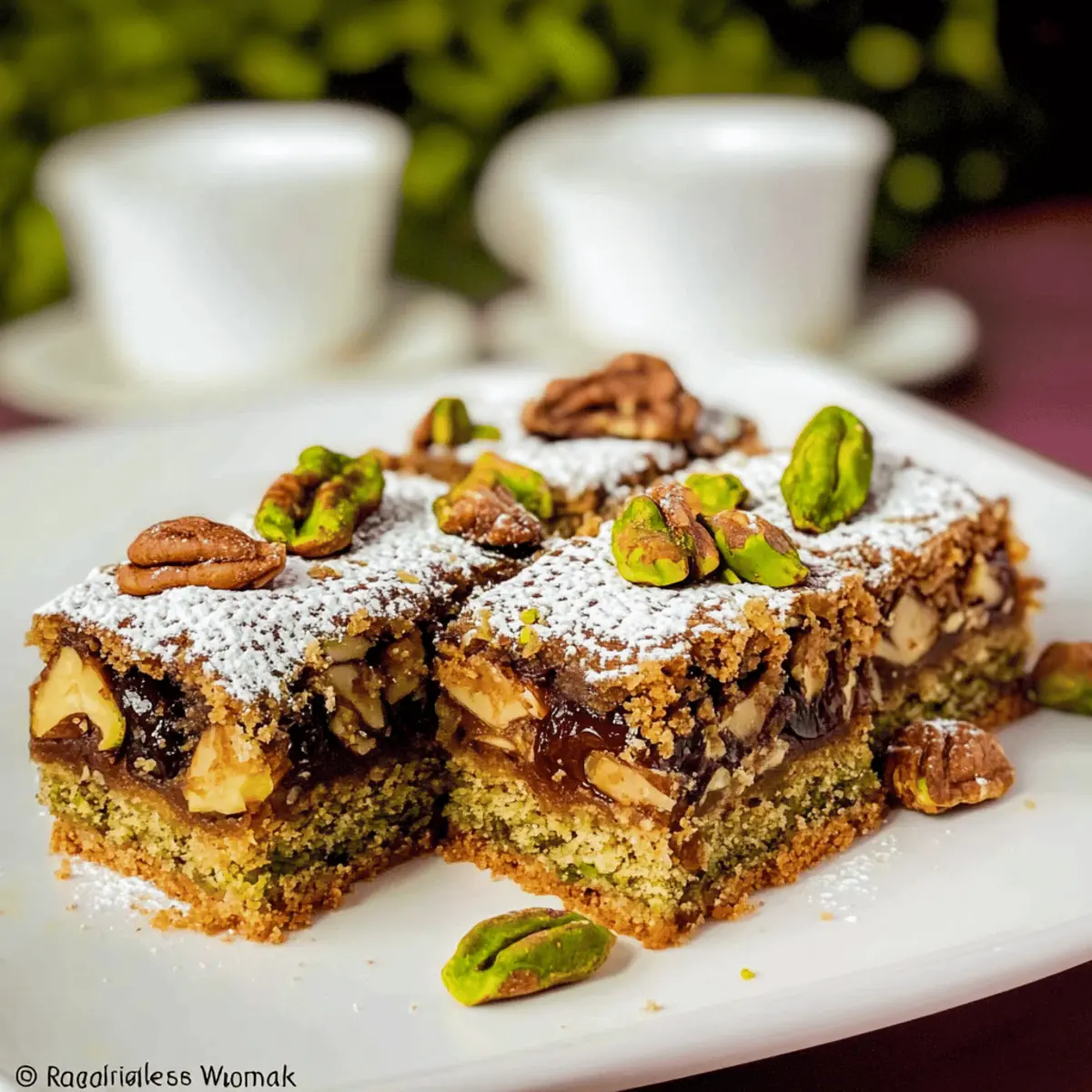 Sift ½ cup of powdered sugar, along with ¾ teaspoon of ground cinnamon and ½ teaspoon of ground cardamom, over the top of the flour mixture. Finally, sprinkle 1 cup of ground pistachios or desiccated coconut on top for a lovely finishing touch. Press lightly to help adhere the toppings to your delicious Date Walnut Dessert.