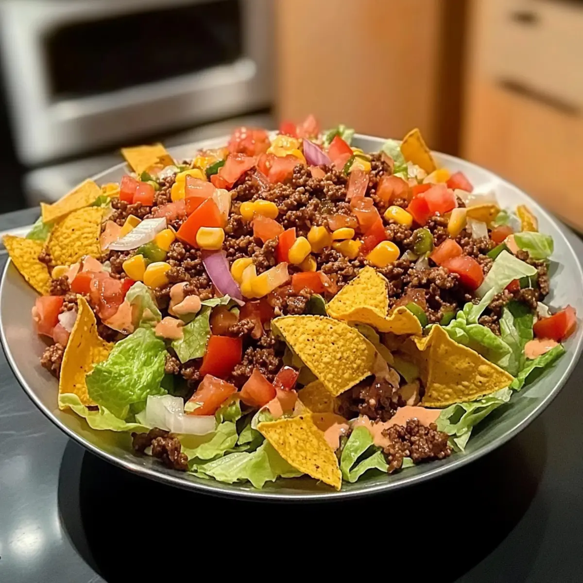 Just before diving in, drizzle your desired dressing—ranch or salsa works wonderfully—over the salad. Toss gently to incorporate the dressing, taking care not to crush the Doritos too much. Serve your Doritos Taco Salad immediately while the chips are crisp, and get ready for that satisfying crunch in every bite!