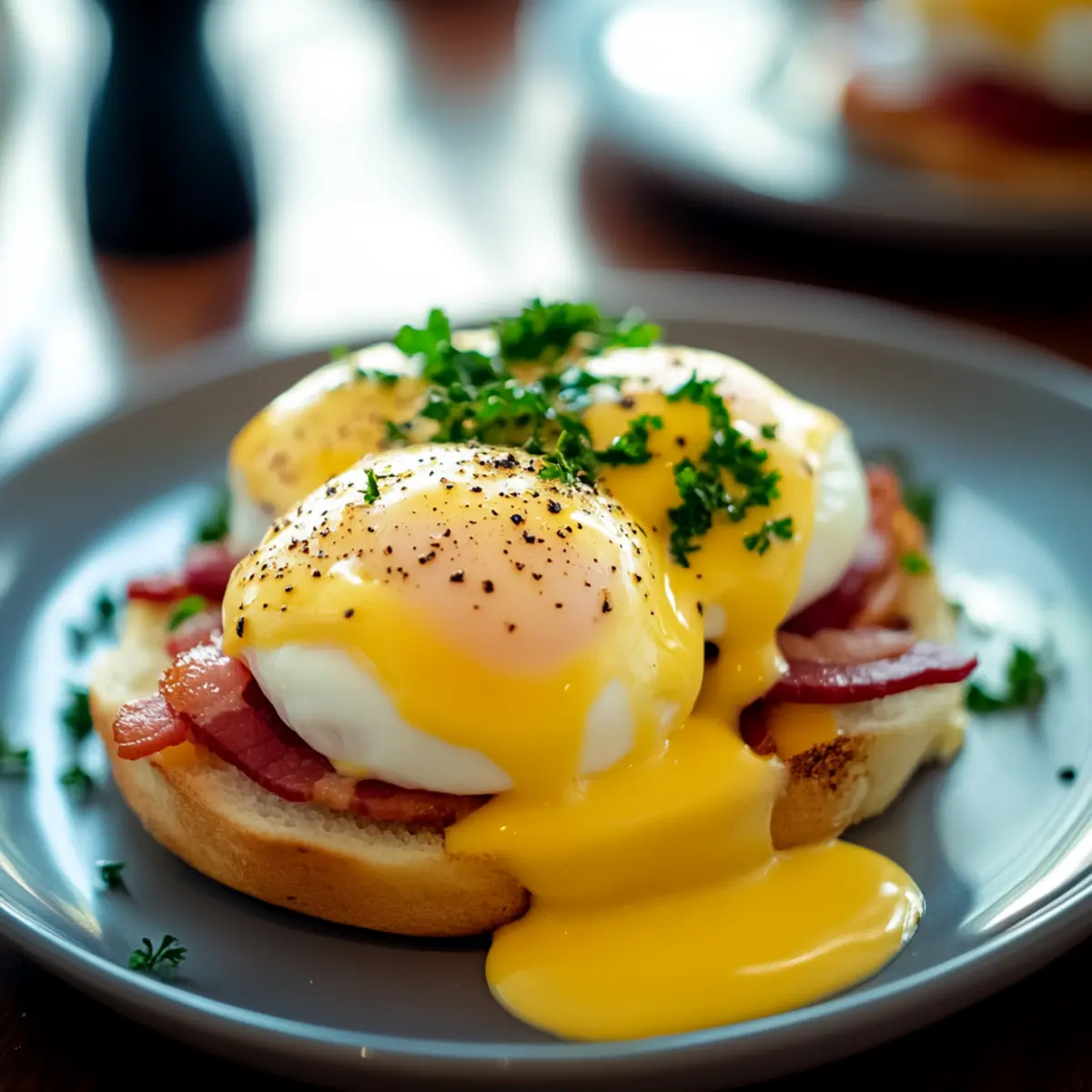 - Assemble the Eggs Benedict by layering a slice of Canadian bacon on each toasted muffin, adding a poached egg on top, and drizzling with the warm hollandaise sauce.