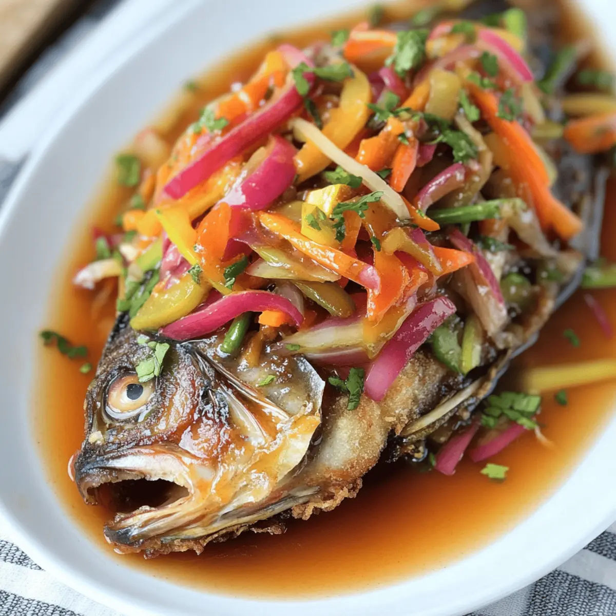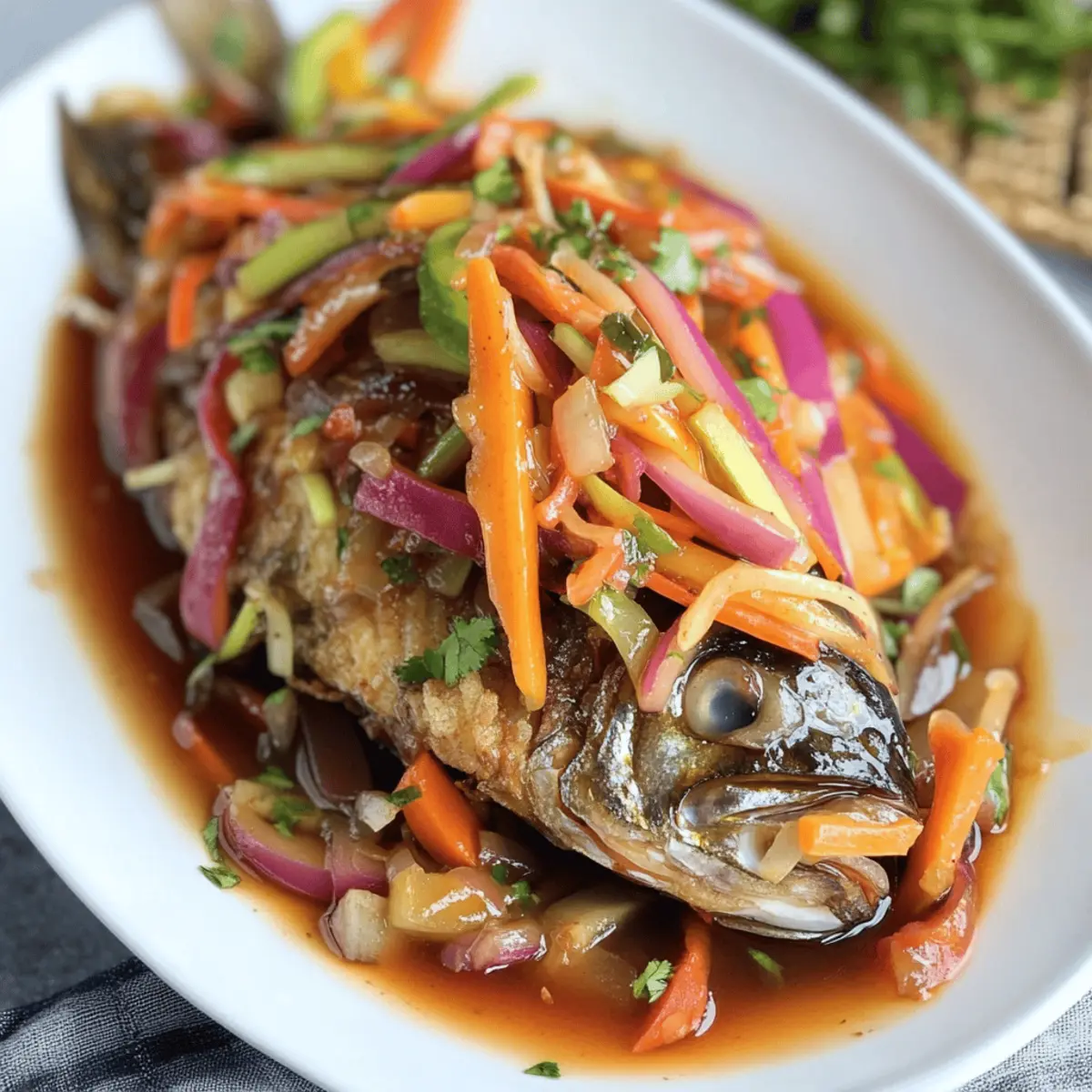 When the fish is perfectly fried, carefully remove it from the skillet and place it on a serving platter. Pour the thickened sweet and sour sauce over the fish, ensuring that the colorful vegetables are evenly distributed across the top. The contrast of the crispy fish and the tangy sauce brings the delicious Escabeche to life. Serve immediately, perhaps with a side of steamed rice for a complete meal.