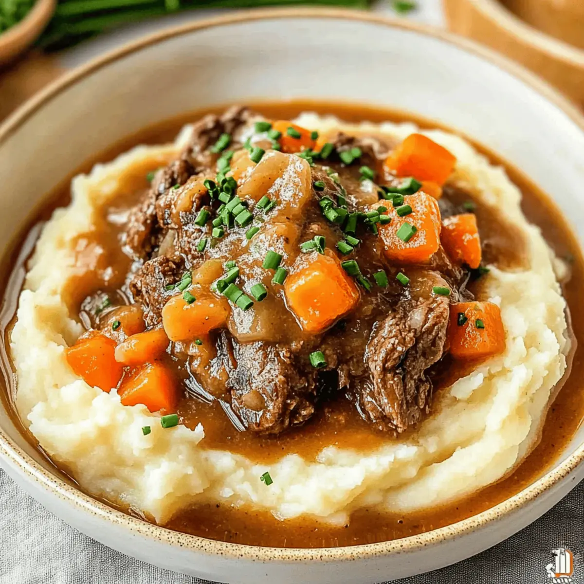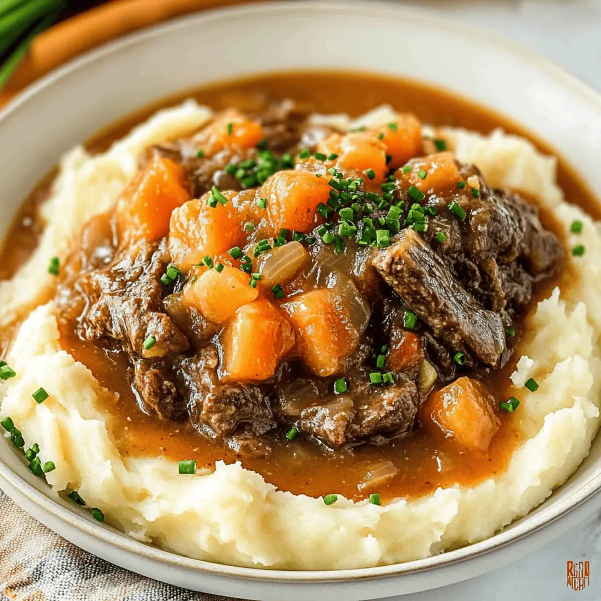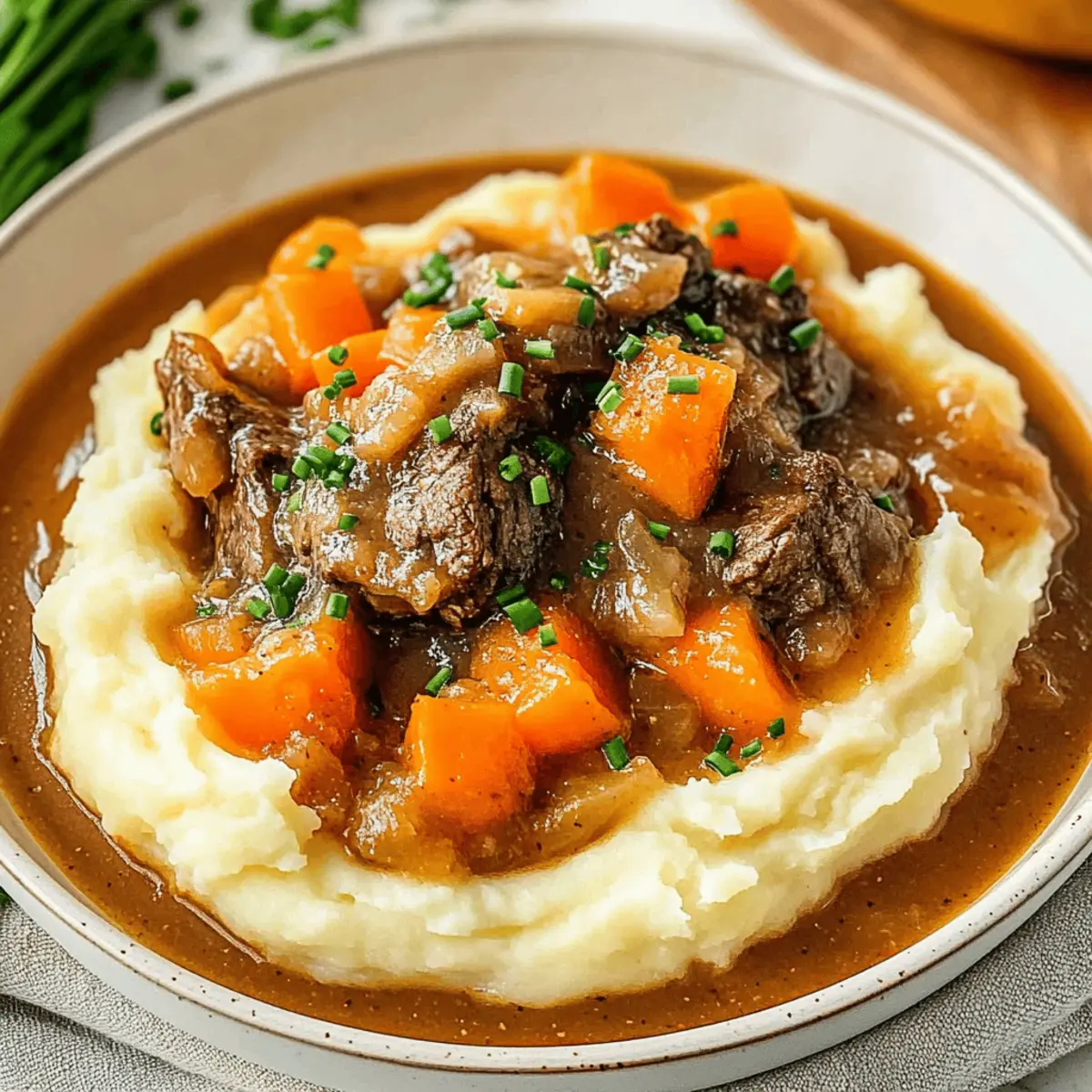 - Serve creamy mashed potatoes topped with the stew and garnish with fresh chives.