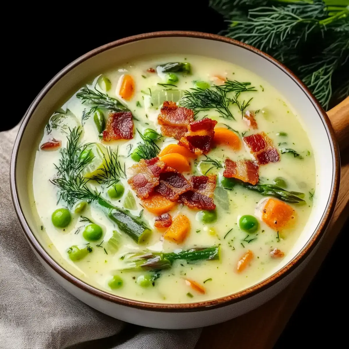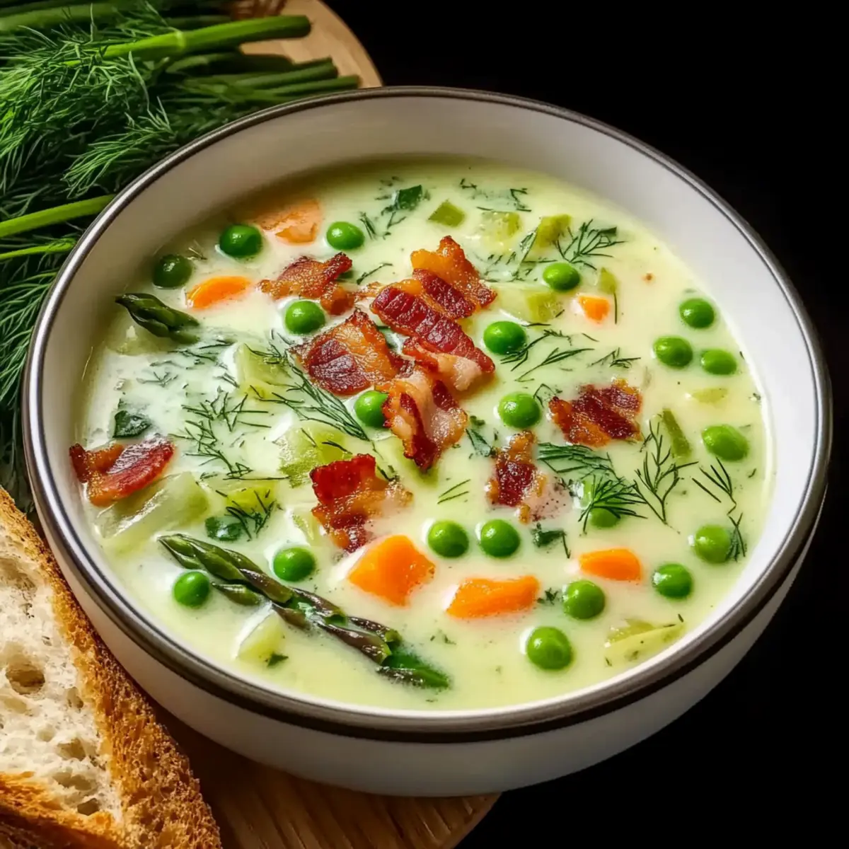 Ladle the warm, comforting French Spring Soup into bowls and garnish generously with the crispy bacon bits you set aside earlier and a sprinkle of extra dill. Pair it with slices of crusty bread for a delightful meal, perfect for cozy evenings spent at home.