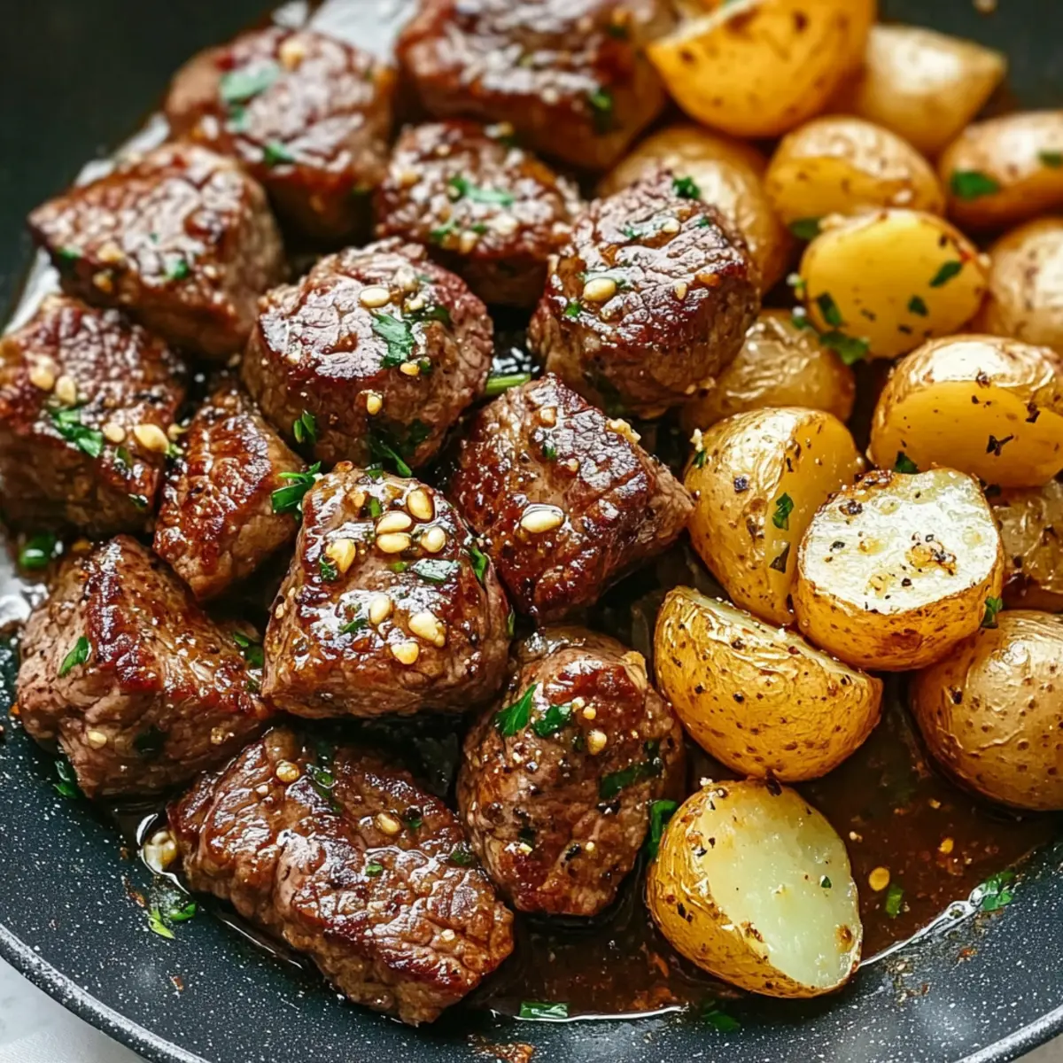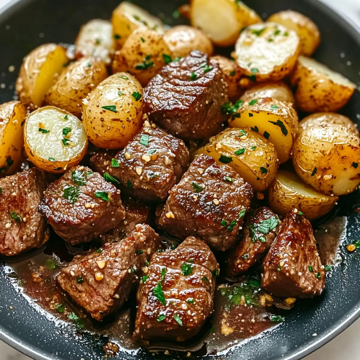Finally, remove the skillet from the heat. Sprinkle freshly chopped parsley over the Garlic Steak Bites and Potatoes for a pop of color and freshness. Serve hot right from the skillet, enjoying the contrast of juicy steak bites and crispy potatoes in their rich buttery goodness.