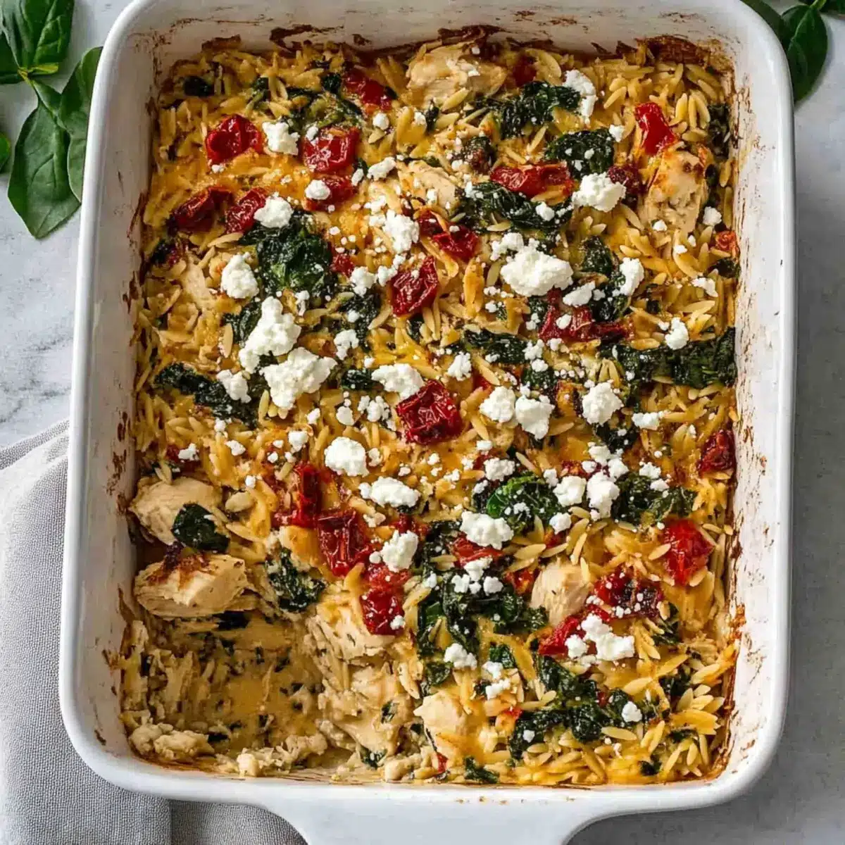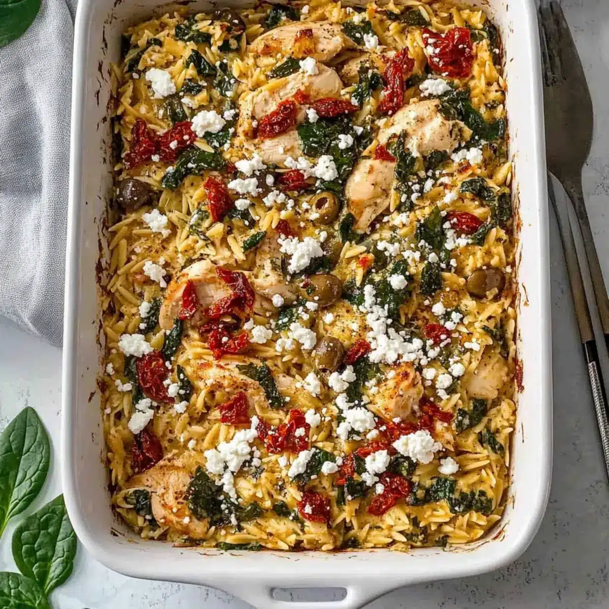 - Combine uncooked orzo, chopped chicken breast, sun-dried tomatoes, baby spinach, feta cheese, and Kalamata olives in a large baking dish.