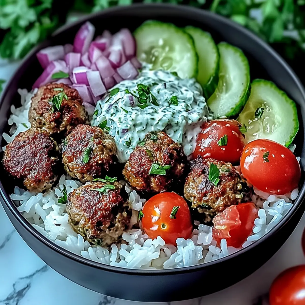 Embrace the beauty of a Greek Meatball Bowl with Tzatziki, featuring rice and fresh veggies, and indulge in a delicious and nourishing meal!