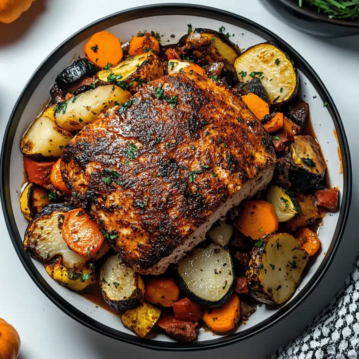 Once the salmon is cooked, remove it from the skillet and arrange it on a serving platter alongside the beautifully roasted vegetables. Garnish with freshly chopped herbs, like parsley or basil, for an uplifting touch. Your delightful salmon with charred vegetables is now ready to bring warmth and festivity to your cozy Halloween dinner!
