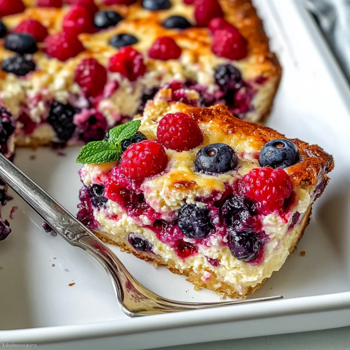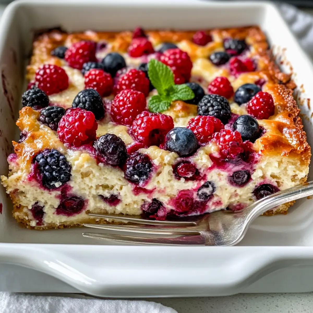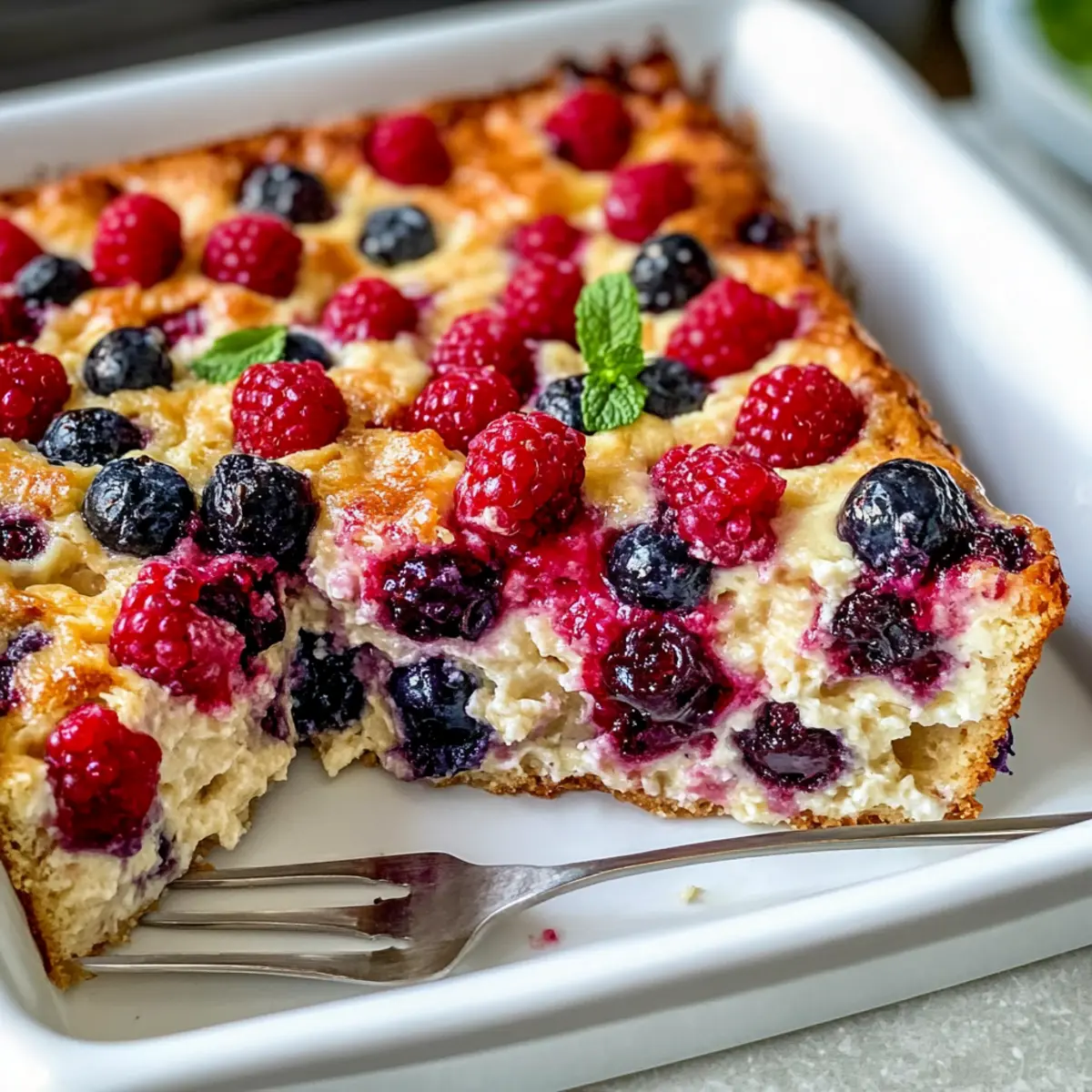 Absolutely! You can use a mix of fresh or frozen berries such as blueberries, raspberries, or strawberries. If using frozen berries, make sure not to thaw them before adding to the batter. This helps retain their shape and prevents the bake from becoming watery.