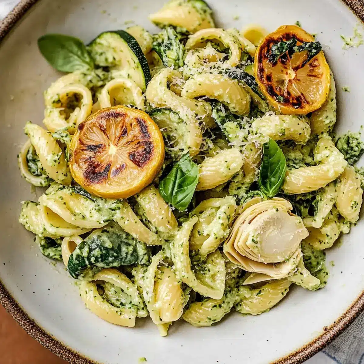 In a blender, combine fresh basil, parsley, lemon zest, garlic, pepitas, plant-based yogurt, miso paste, remaining oil, lemon juice from the caramelized lemons, and a pinch of salt. Blend until smooth and creamy. Taste and adjust seasoning as needed to ensure a vibrant flavor perfect for your Lemon Basil Pasta Salad.