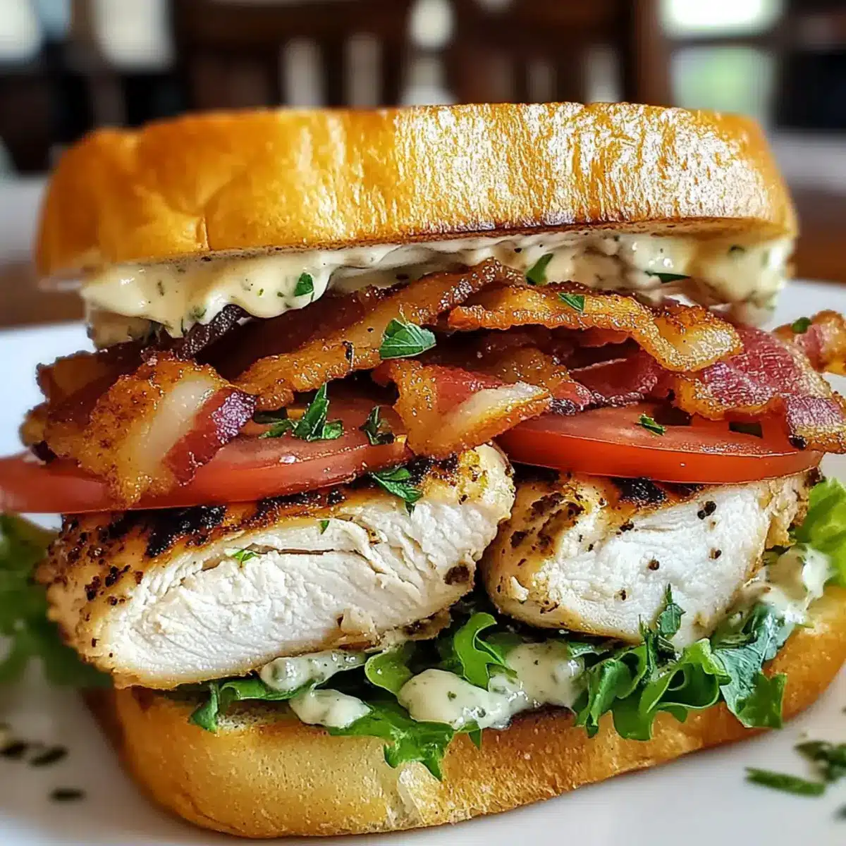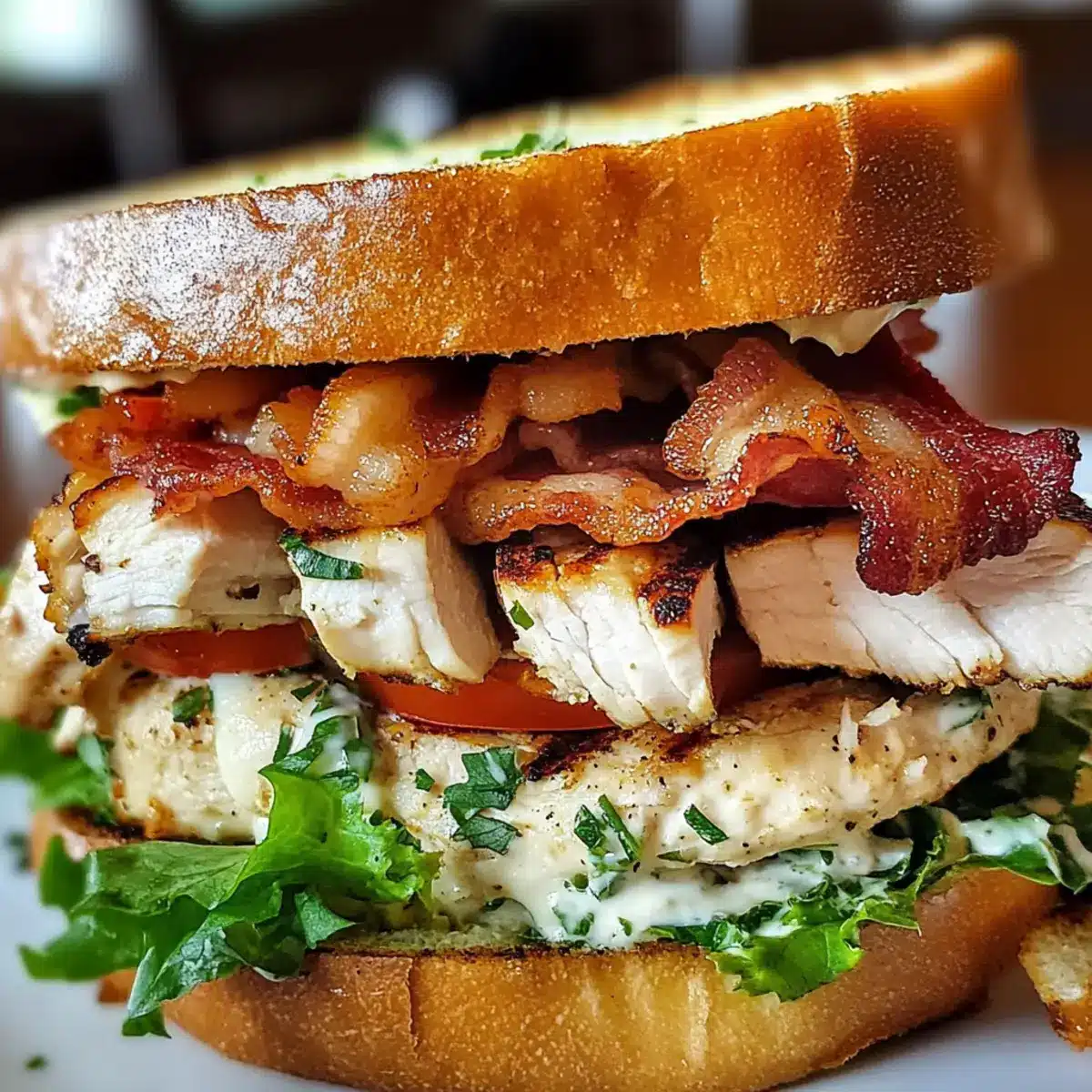 - Assemble the sandwich by spreading garlic herb mayo, adding lettuce, tomatoes, chicken, and bacon, then topping with another slice.