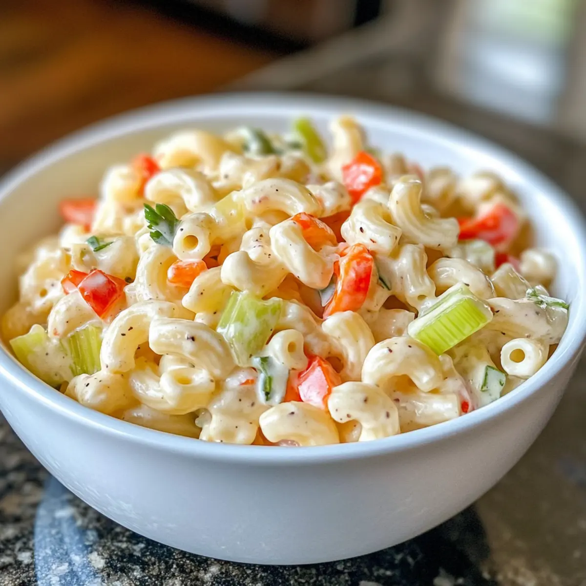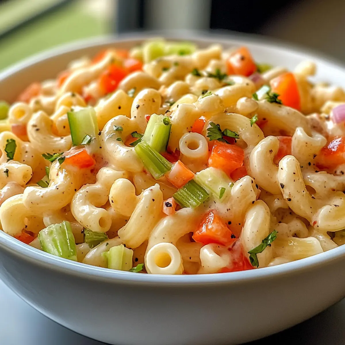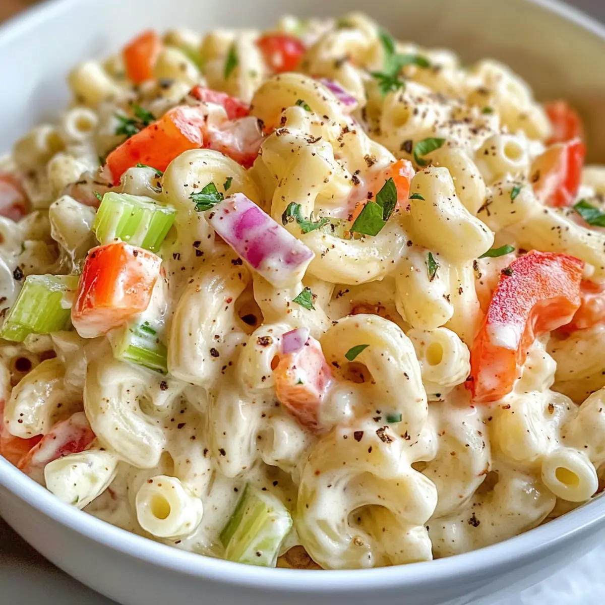 The kitchen clock ticks quietly, but my mind races with fond memories of summer cookouts filled with laughter and delicious, homemade dishes. One staple that always stole the show was the beloved creamy macaroni salad. This irresistible dish combines tender macaroni with crunchy vegetables like celery and red bell pepper, all enveloped in a tangy dressing that’s downright addictive. Not only is this macaroni salad a comfort food classic, it’s also a breeze to prepare—taking just 15 minutes of your time. Whether you’re headed to a lively potluck or just looking to spice up your family dinner, this creamy macaroni salad is the perfect sidekick. Who wouldn’t want to bring a bit of joy to their table? Ready to make a dish that will have everyone going back for seconds?