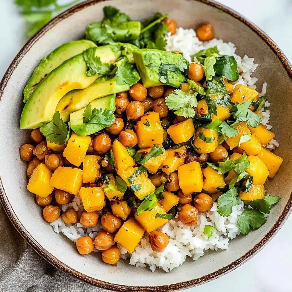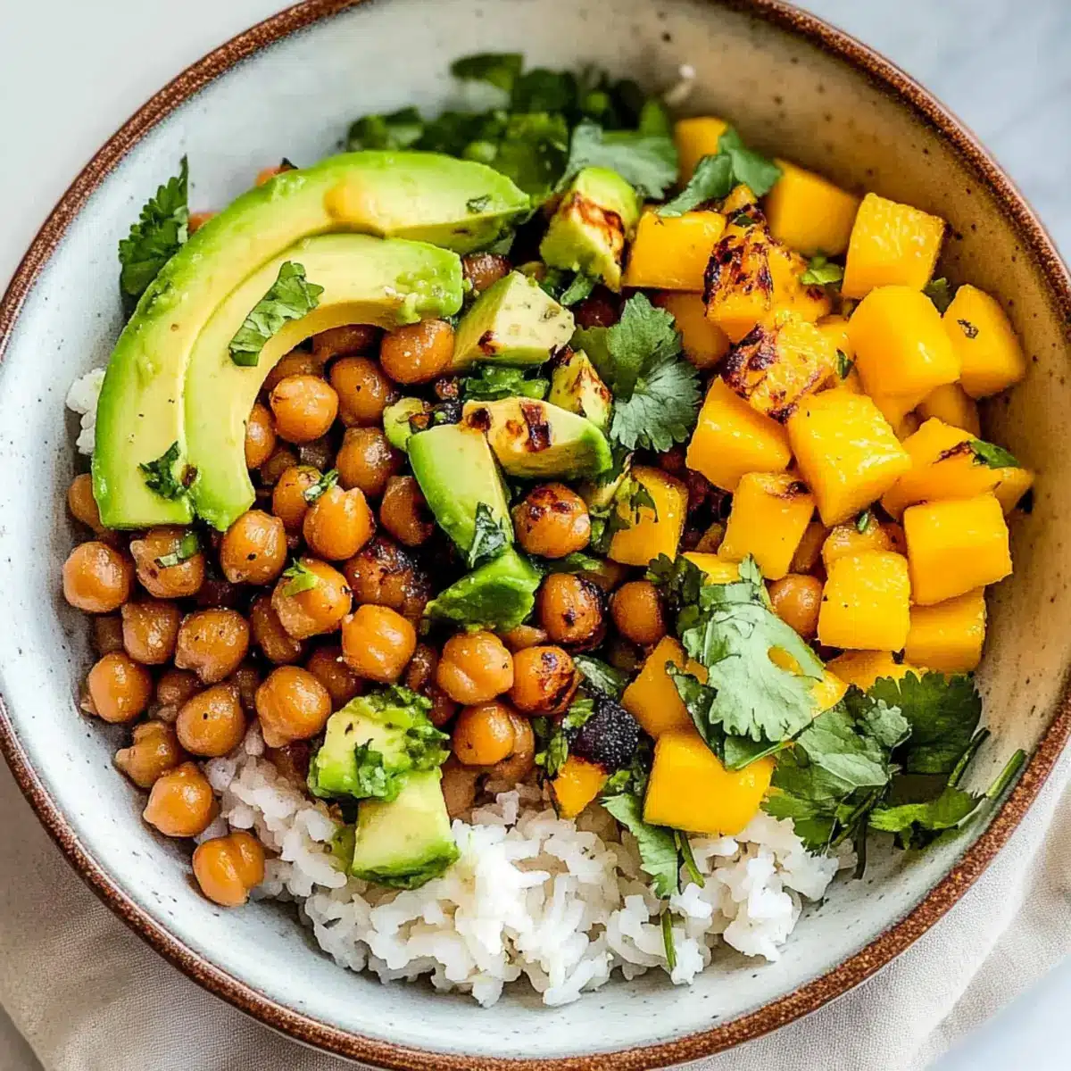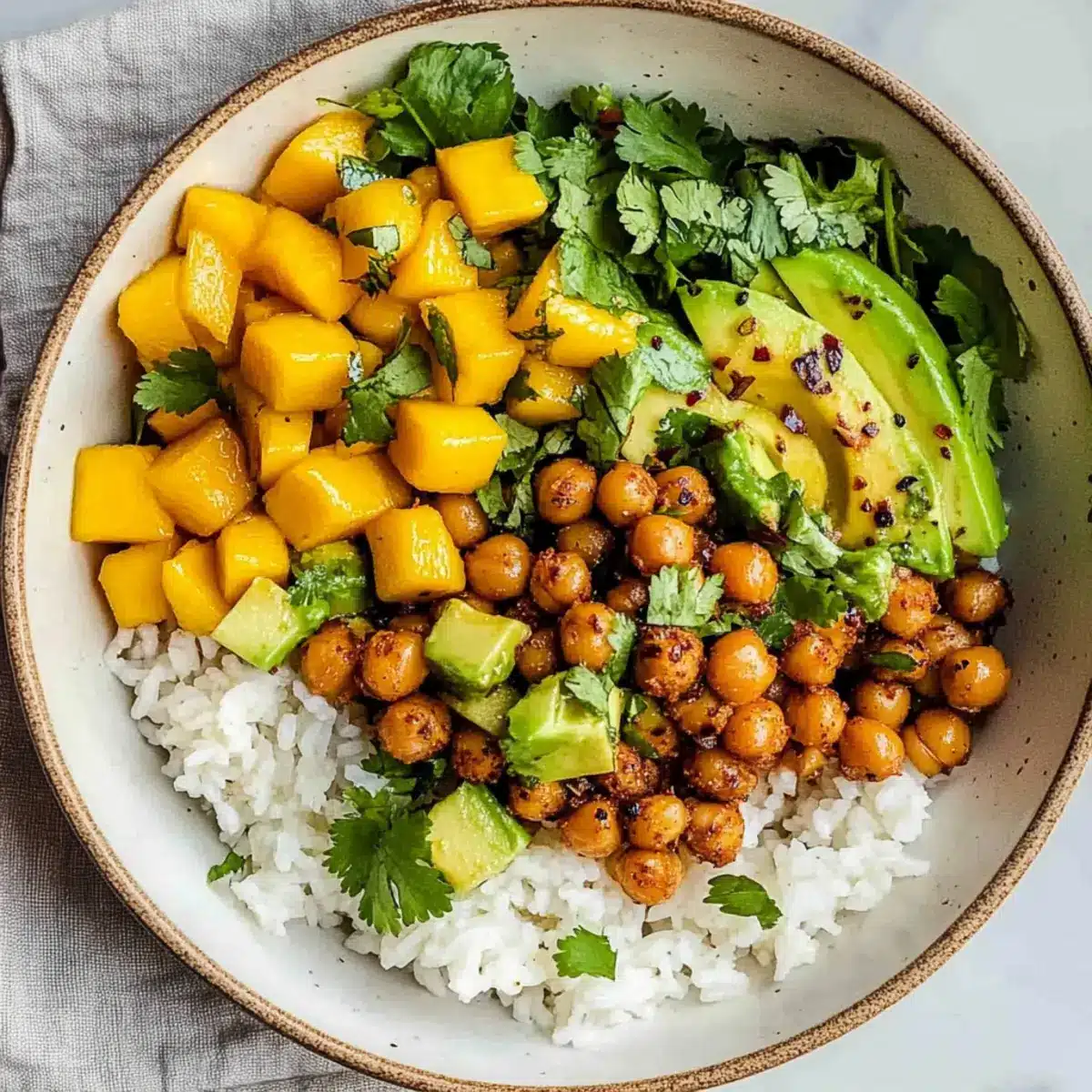 - To assemble, layer warm rice, top with the mango avocado salad, and finish with roasted chickpeas and cilantro.