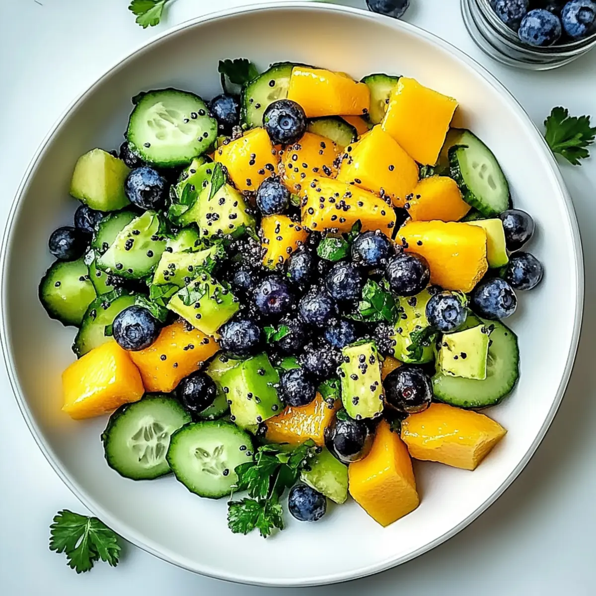 Vibrant Flavors: The Mango Cucumber Salad with Blueberries and Avocado bursts with tropical sweetness and creamy richness, transforming every bite into a delight.