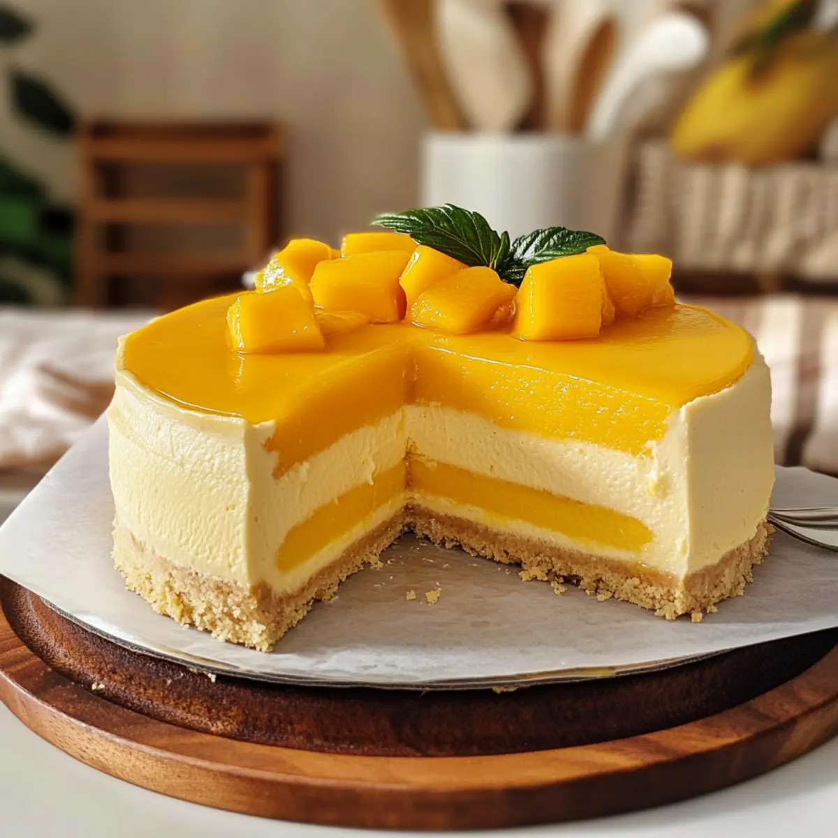 - Bloom gelatin by sprinkling it over cold water and let it sit for about 5 minutes. Blend ripe mango chunks until smooth, reserving about 400 grams for the mango curd. Microwave the bloomed gelatin until fully dissolved, then mix it into the mango puree. Whip the cream until stiff peaks form; gently fold into the mango mixture. Pour the mousse over the cooled cake and smooth the top. Refrigerate for at least 2-3 hours to set.