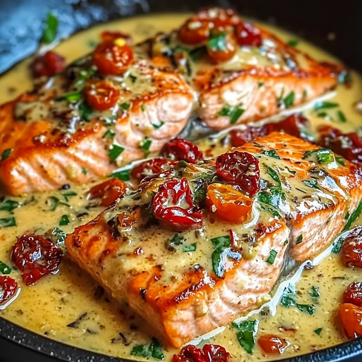 - Prepare the Sauce: Remove salmon and lower heat. Add butter and let it melt. Sauté minced garlic until fragrant, then add sun-dried tomatoes and Italian herbs.