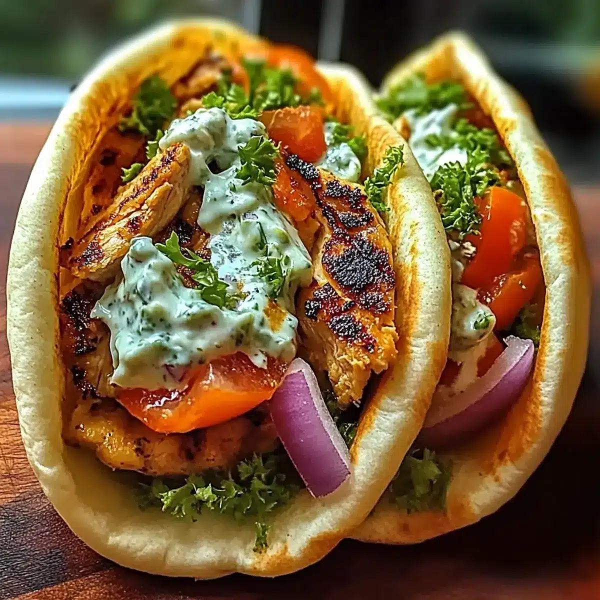 - Assemble gyros by placing sliced chicken in each pita, topping with tzatziki, cherry tomatoes, red onion, and parsley. Wrap tightly.