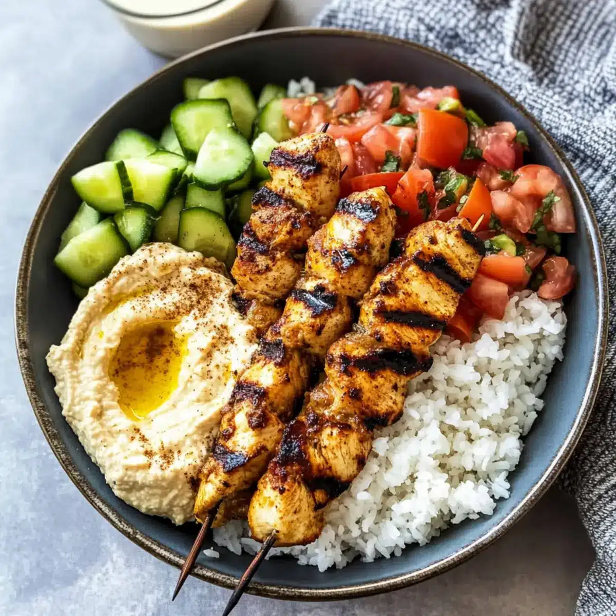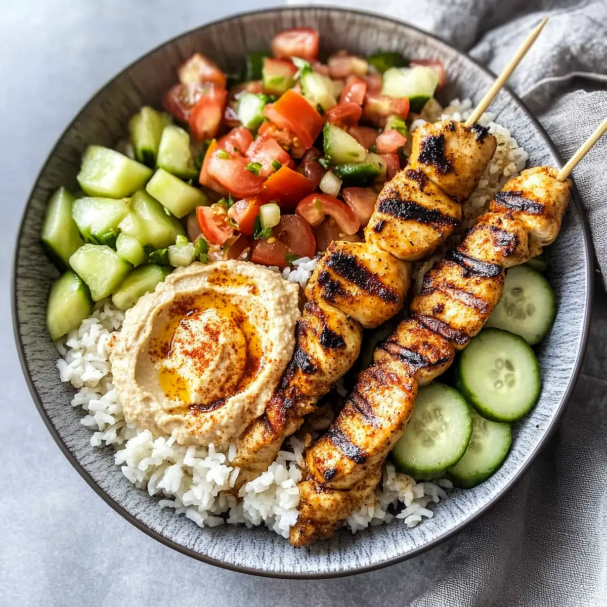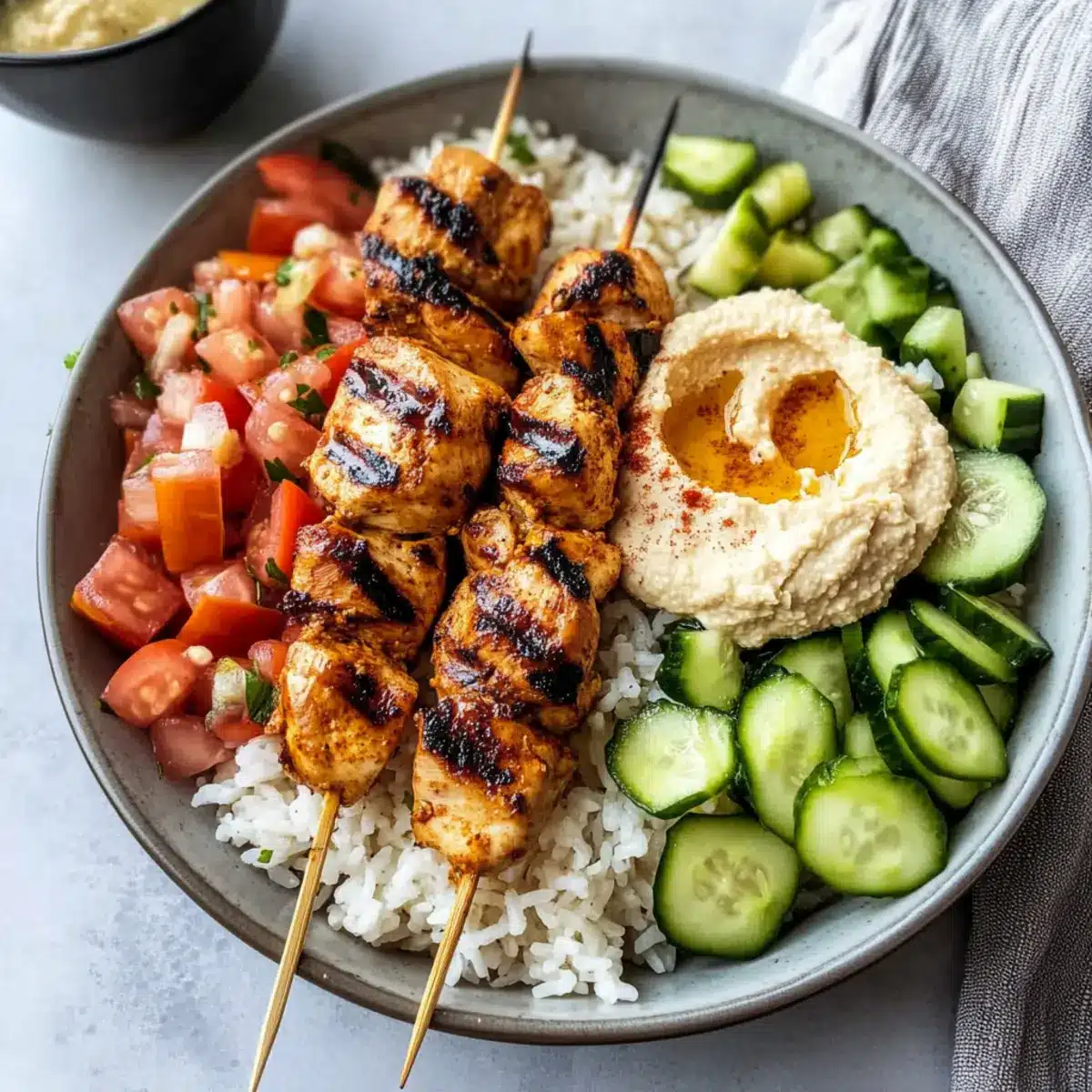 Mediterranean Rice Bowl with Grilled Chicken Tawook Skewers Bliss