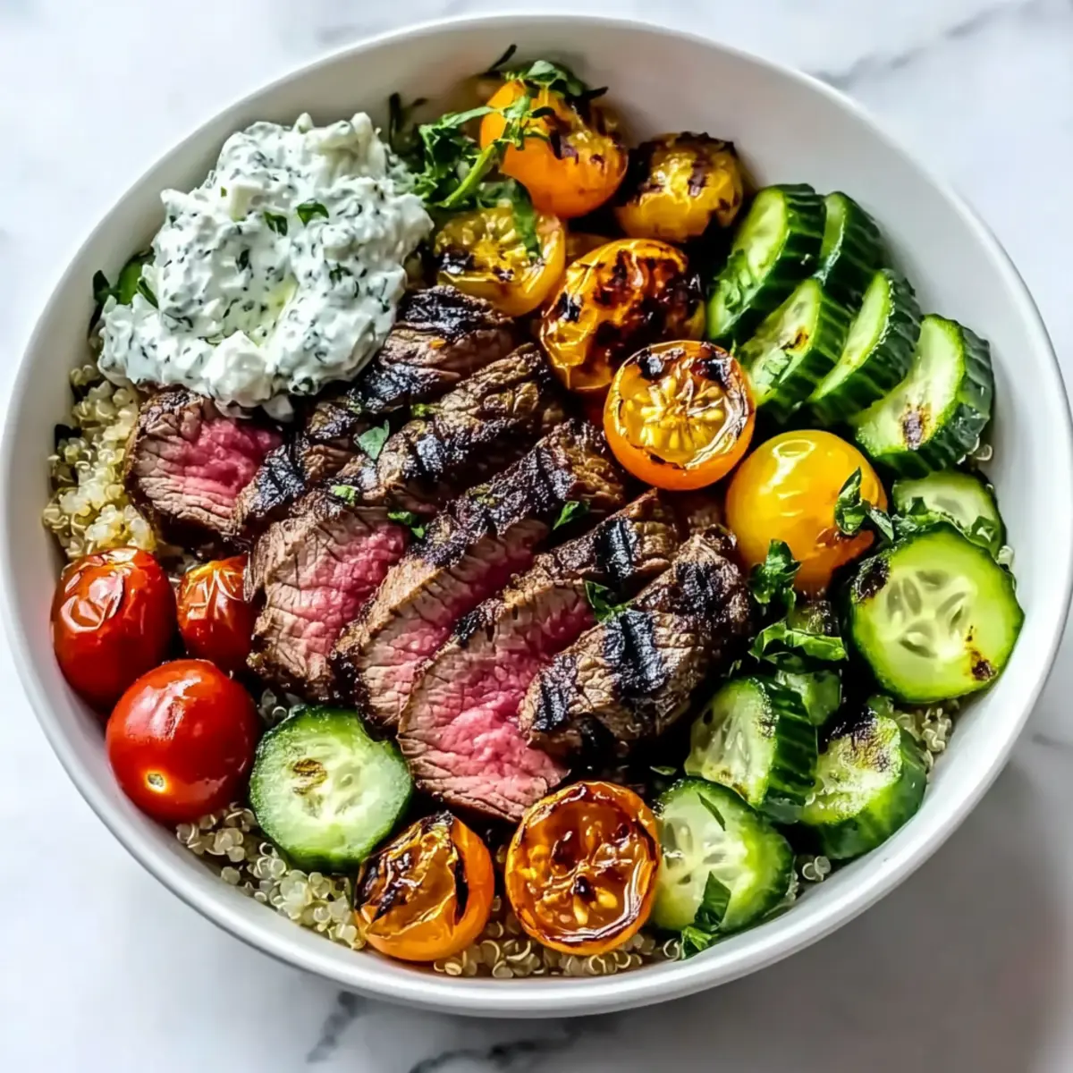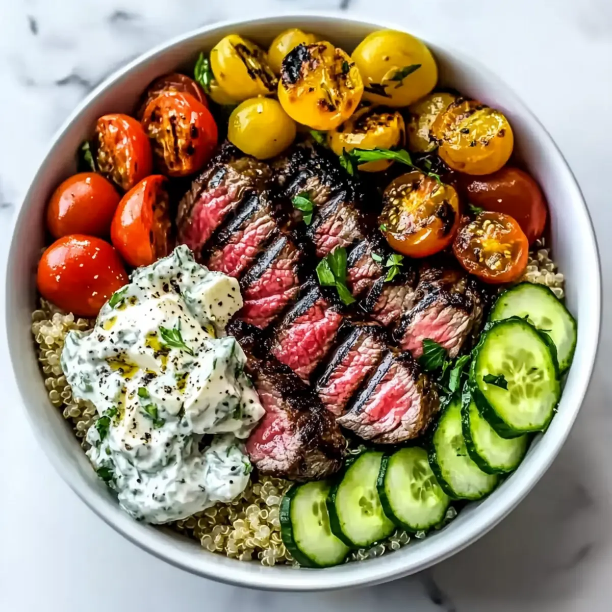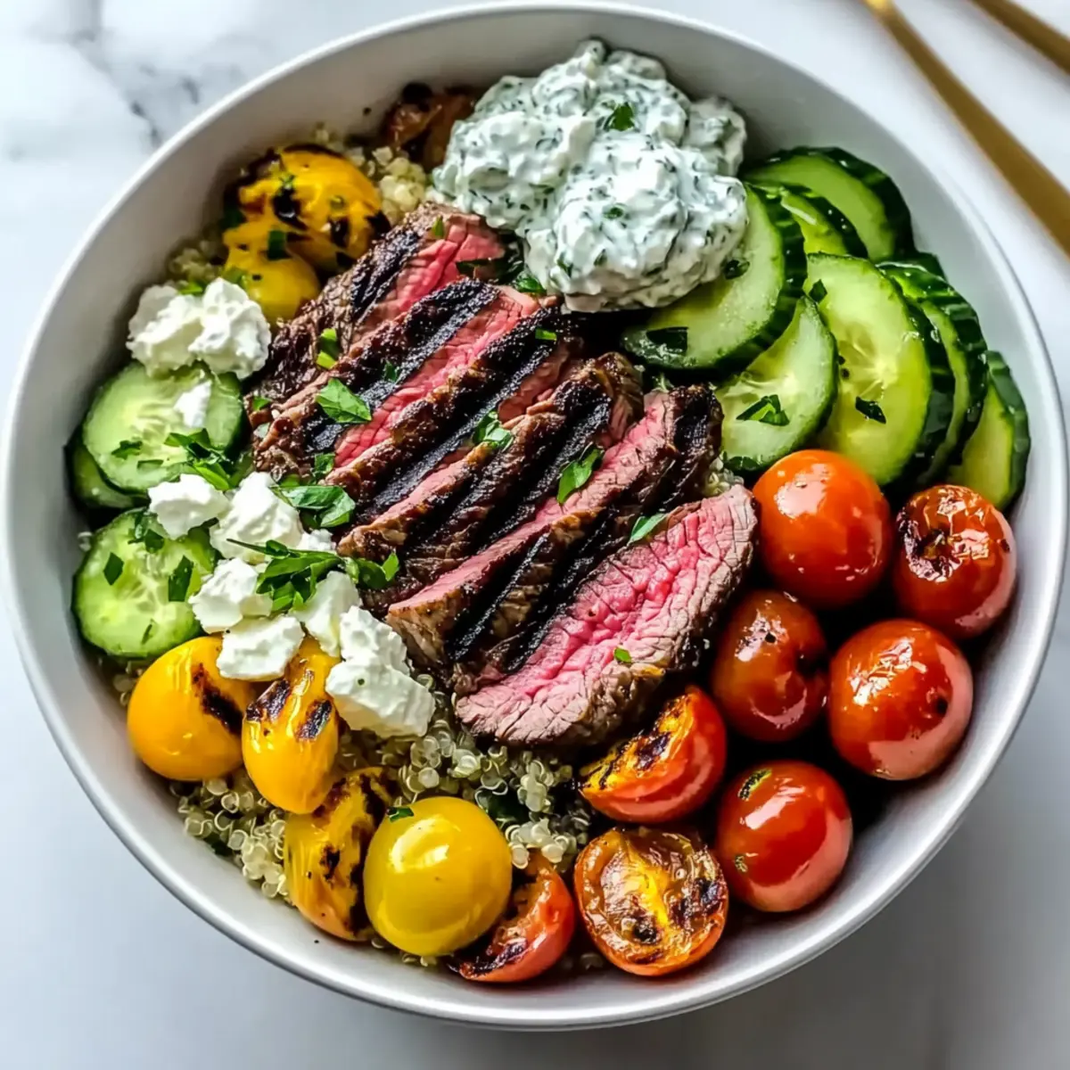 Begin layering your Mediterranean Steak Bowl by placing a generous serving of cooked grains—like quinoa or brown rice—at the bottom. Next, artfully arrange slices of the warm, grilled steak over the grains. Top it with roasted chickpeas, diced cherry tomatoes, cucumber pieces, red onion slices, and feta cheese for creaminess.