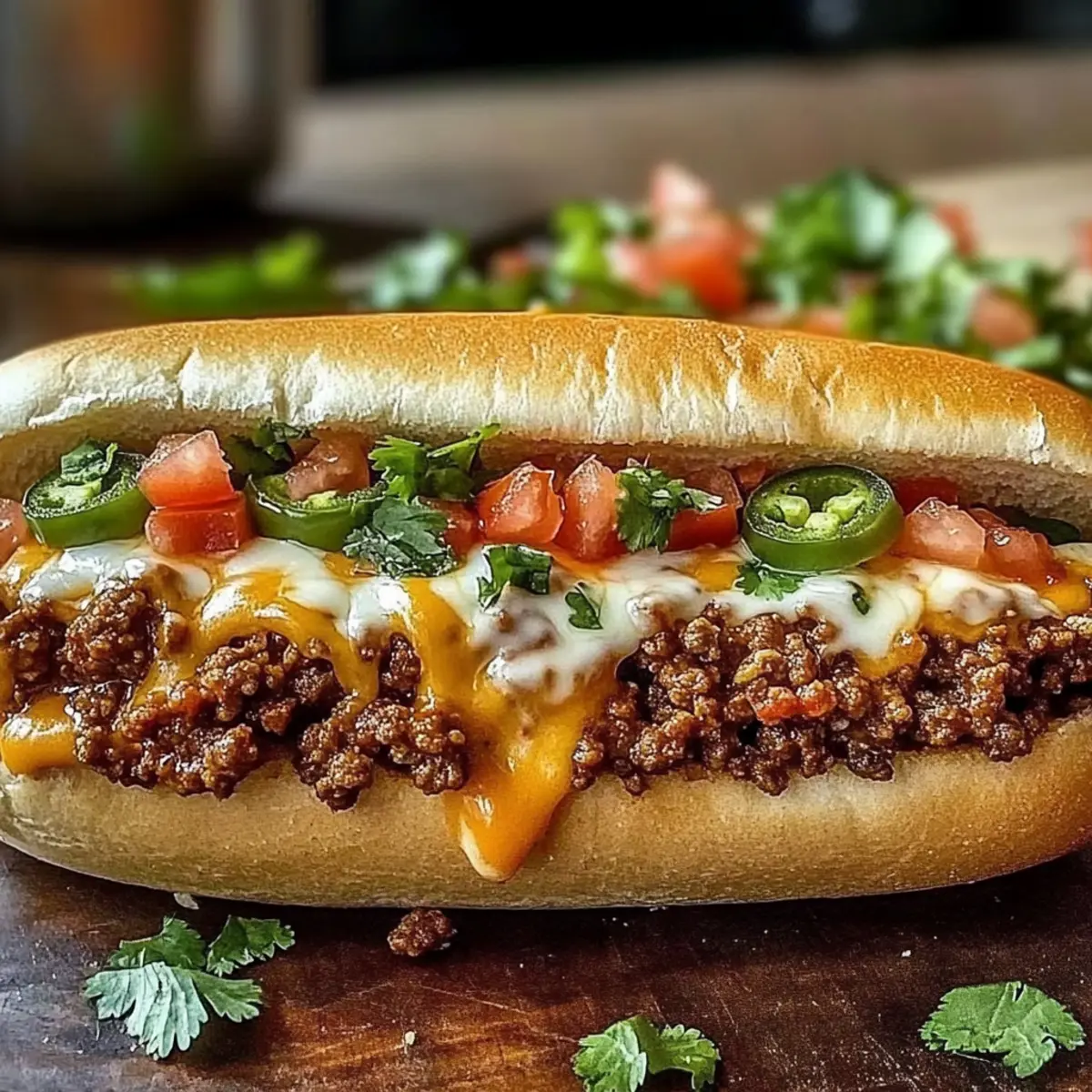 - Assemble the sandwich by spooning the cheesy beef mixture onto the roll and topping with onion, tomato, cilantro, and jalapeño.