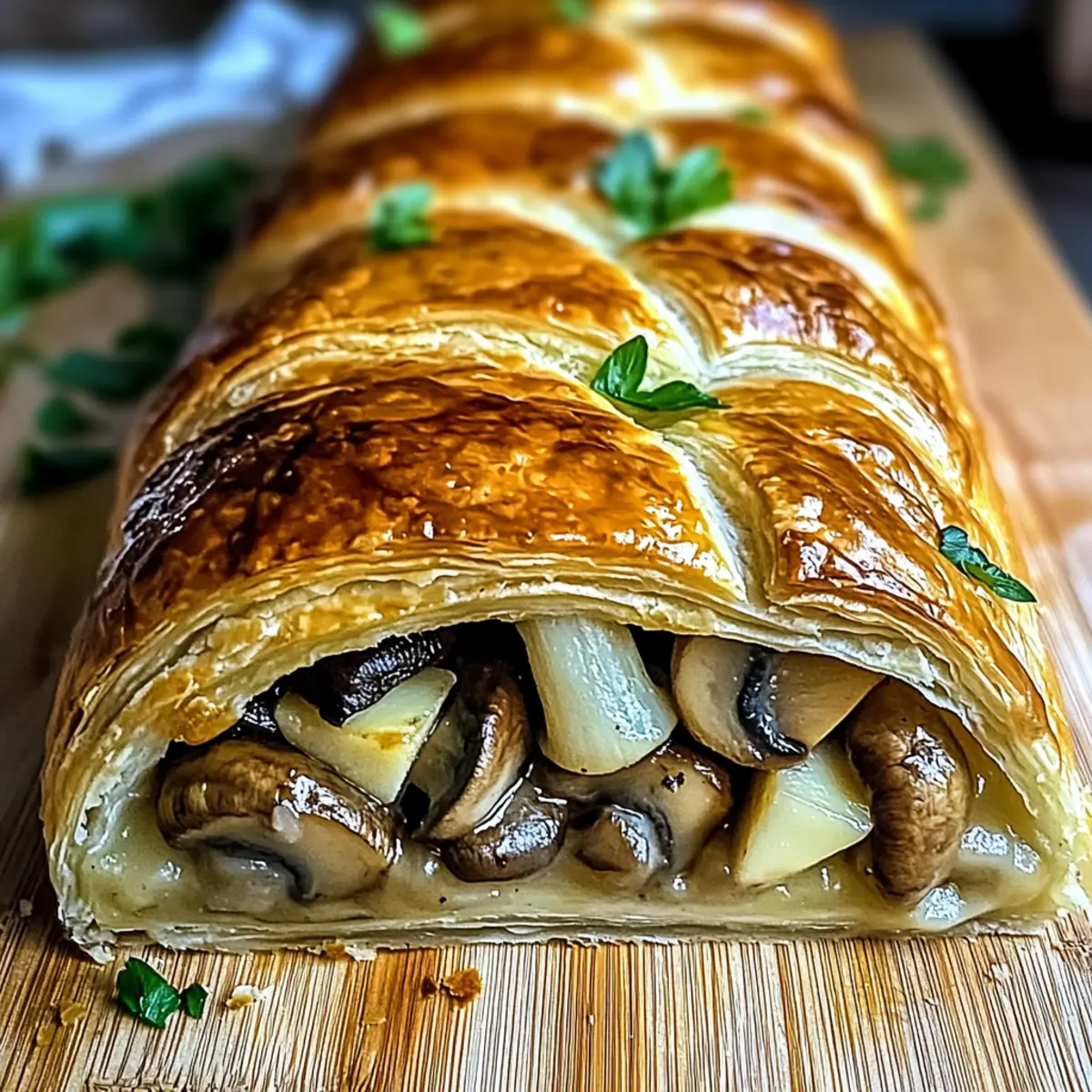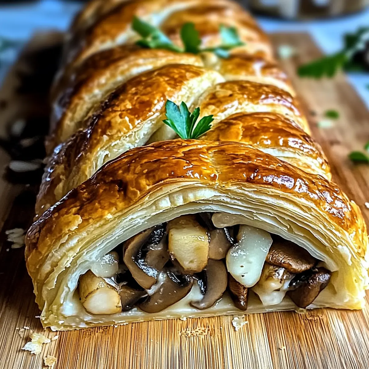 Spoon the cooled filling along the center of the puff pastry rectangle. Starting from one end, fold the diagonal strips of pastry over the filling, alternating sides to create a braid-like appearance. This visual appeal adds to the show-stopping effect of your Mushroom & Gruyère Puff Pastry Braid.