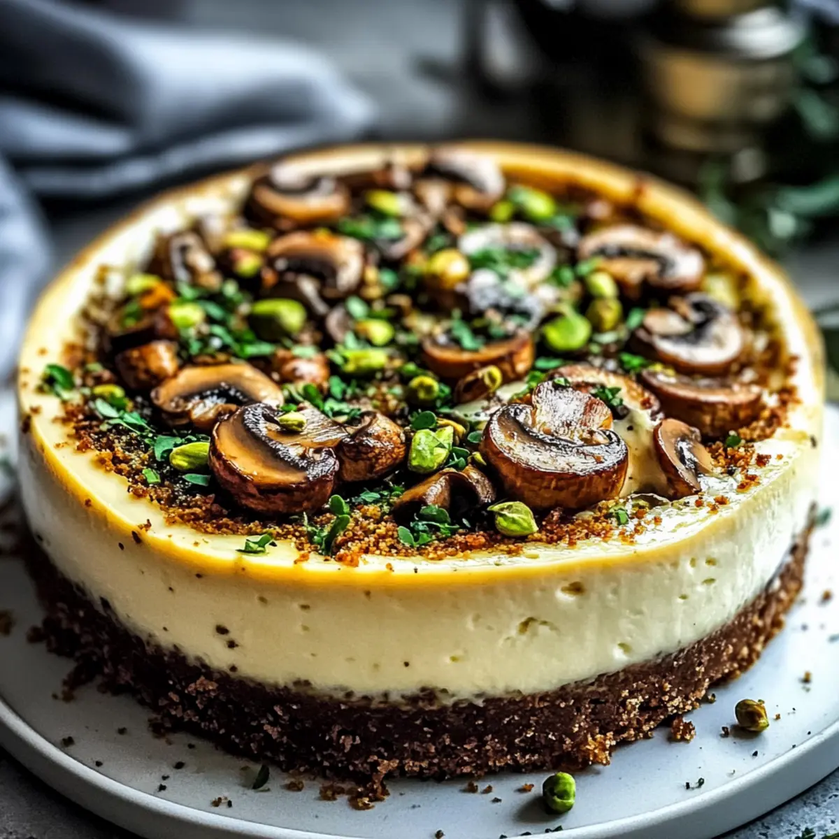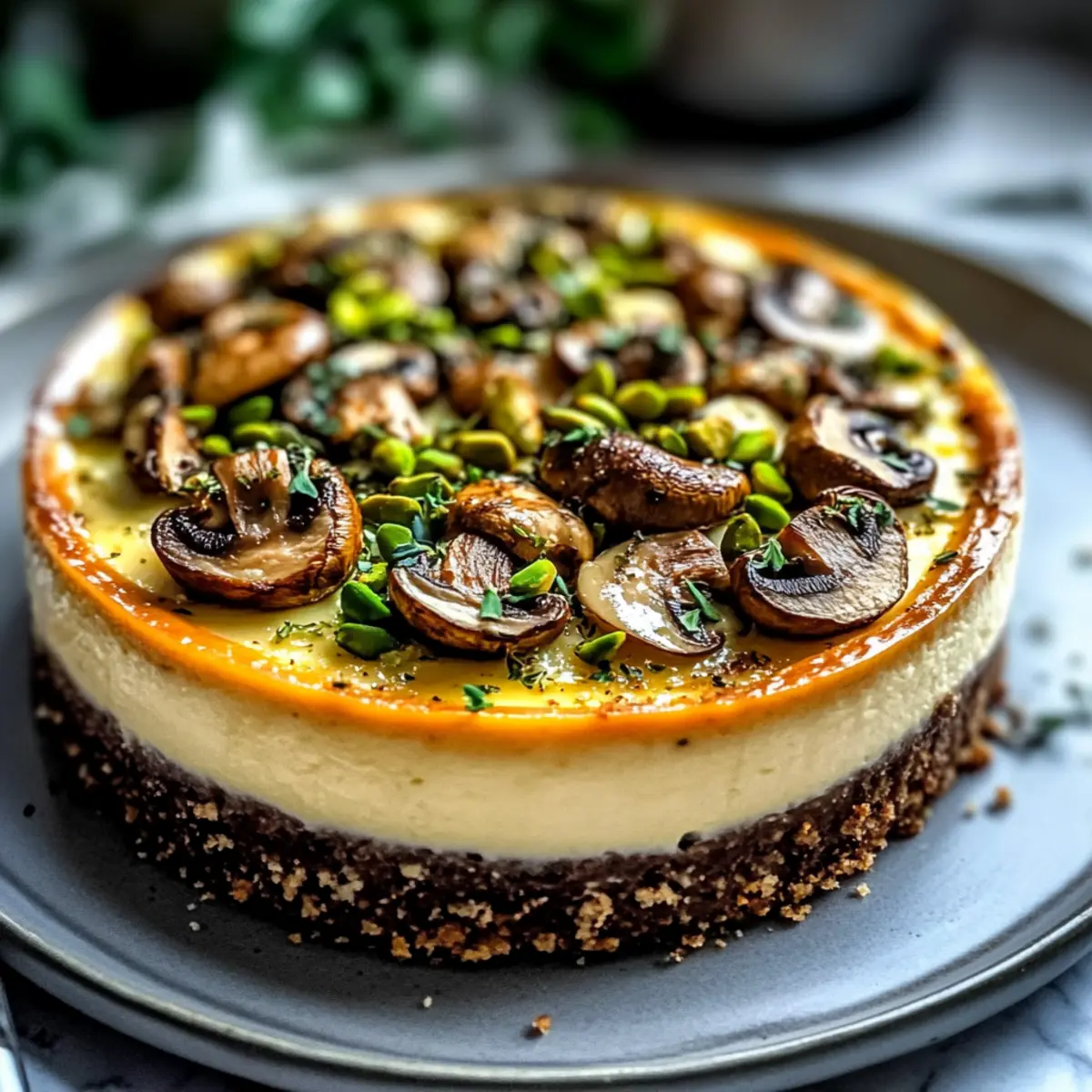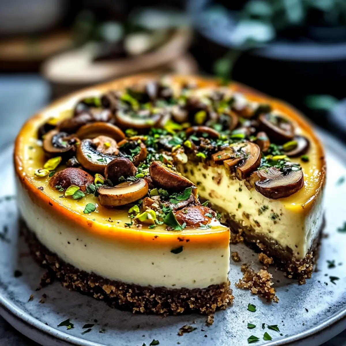 Savory Pistachio and Mushroom Cheesecake with Feta Crust