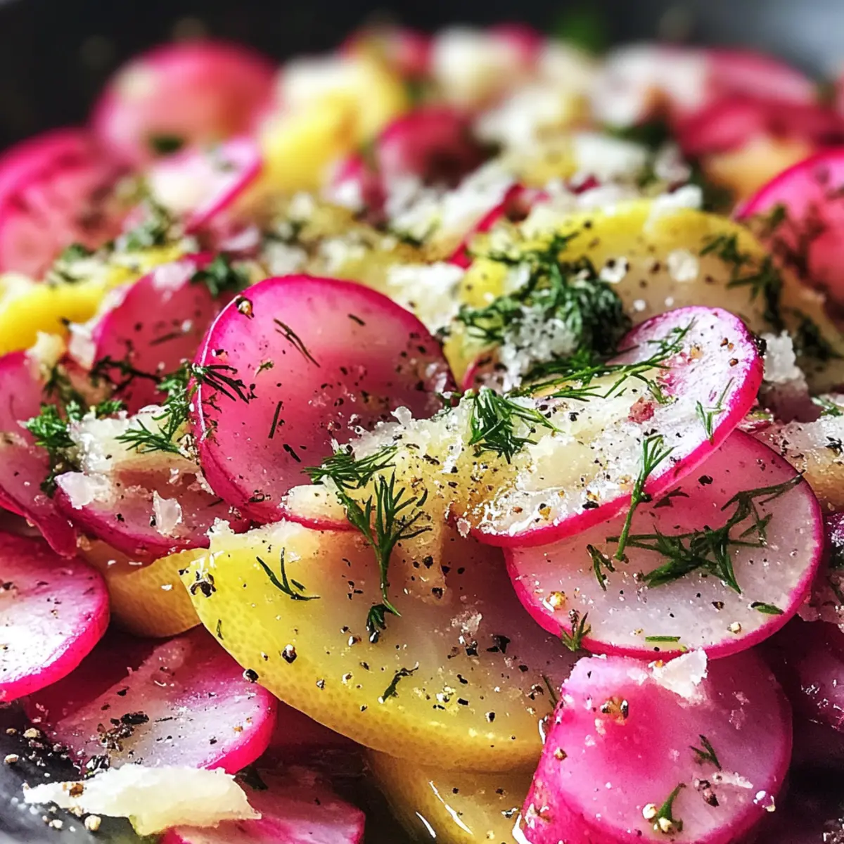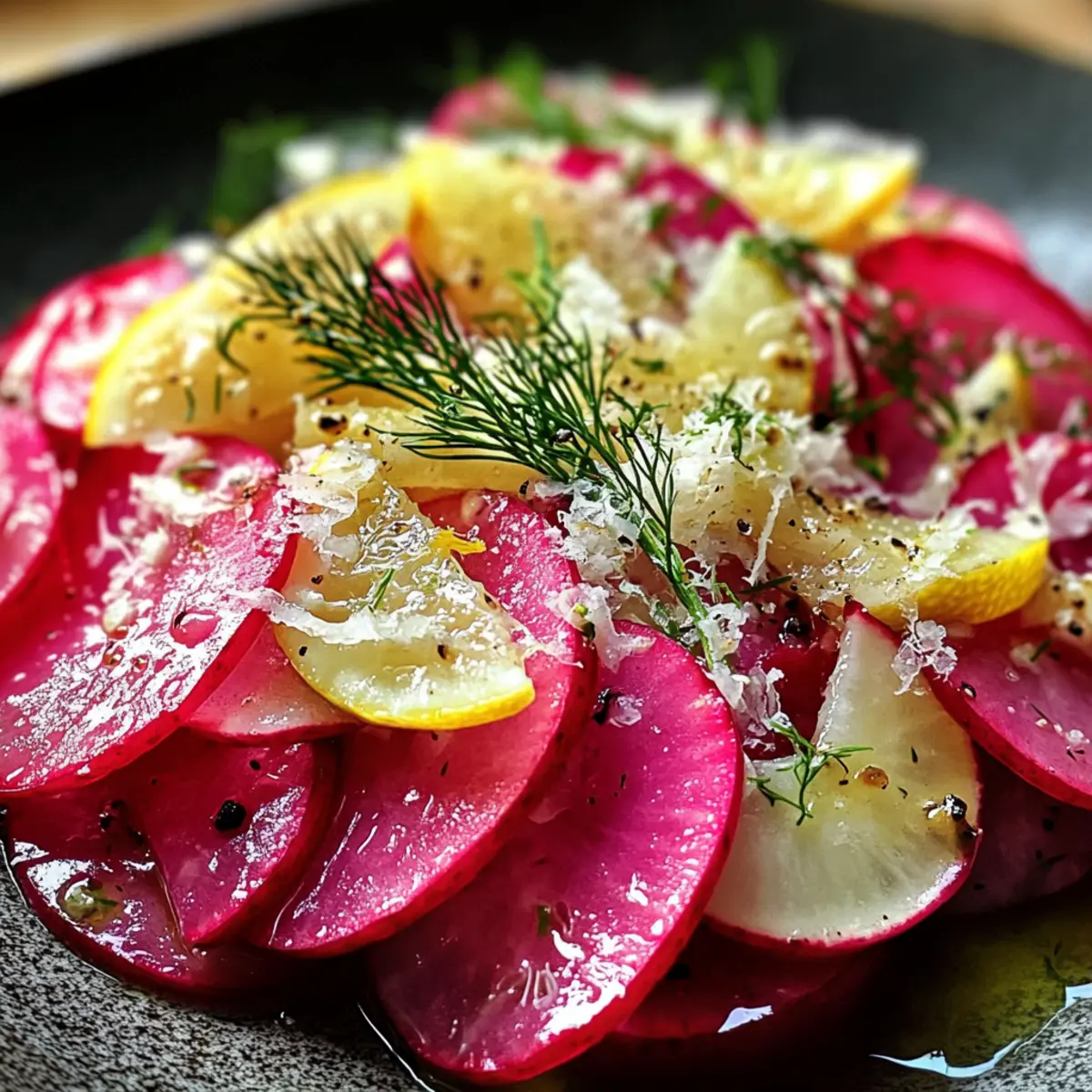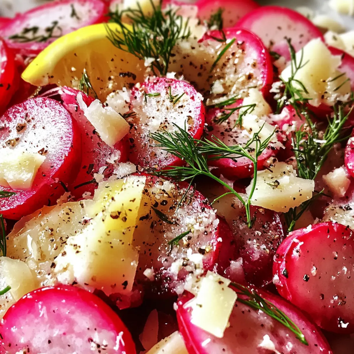 Now it’s time to present your vibrant radish salad! Carefully transfer the dressed radishes onto a serving platter or individual plates, fanning them out to create an inviting display. Garnish the top with fresh lemon zest, a sprinkle of additional grated Parmesan, torn dill leaves, and cracked black pepper for visual appeal and enhanced flavor.