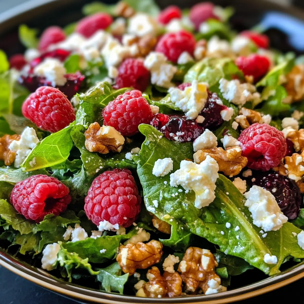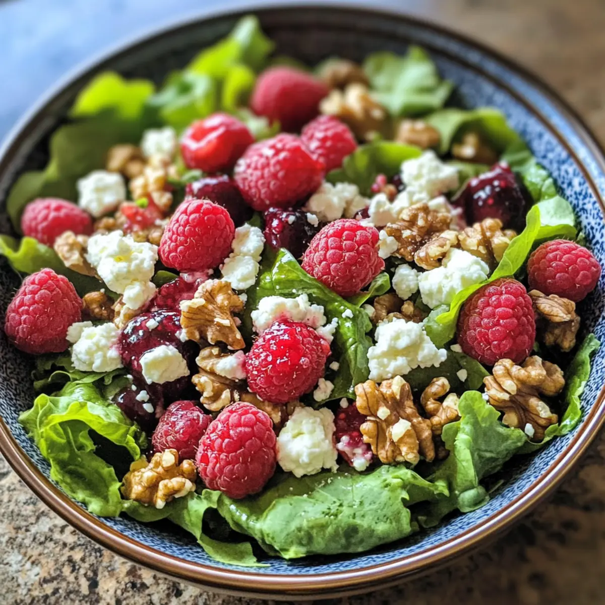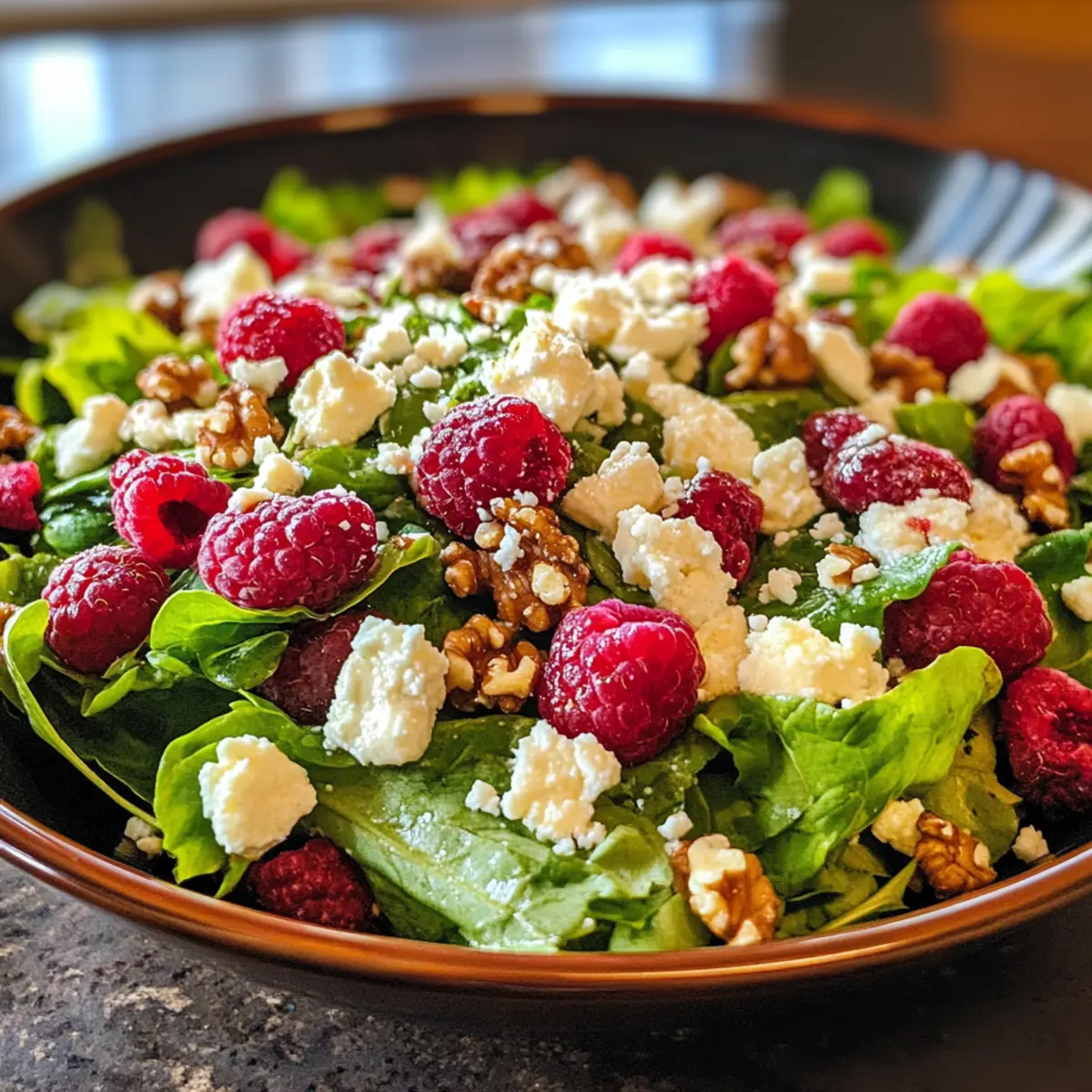 - Scatter raspberries, chopped walnuts, and crumbled feta over the dressed greens. Toss gently to make sure toppings are evenly distributed.