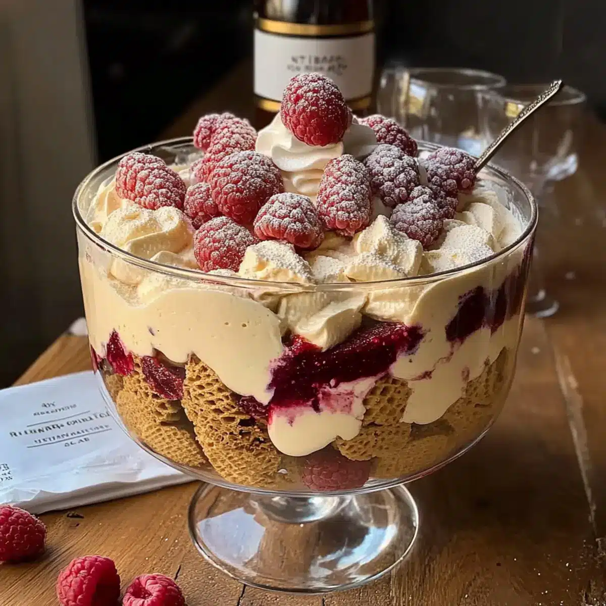 Select a trifle dish or a large glass bowl. Start layering by placing a generous layer of Nilla wafers along the bottom, followed by a layer of the vanilla cardamom custard. Spoon on a layer of rhubarb compote, then scatter fresh raspberries for extra color and flavor. Repeat the layering process, finishing with the custard on top. Take a moment to smooth the top for a beautiful finish.