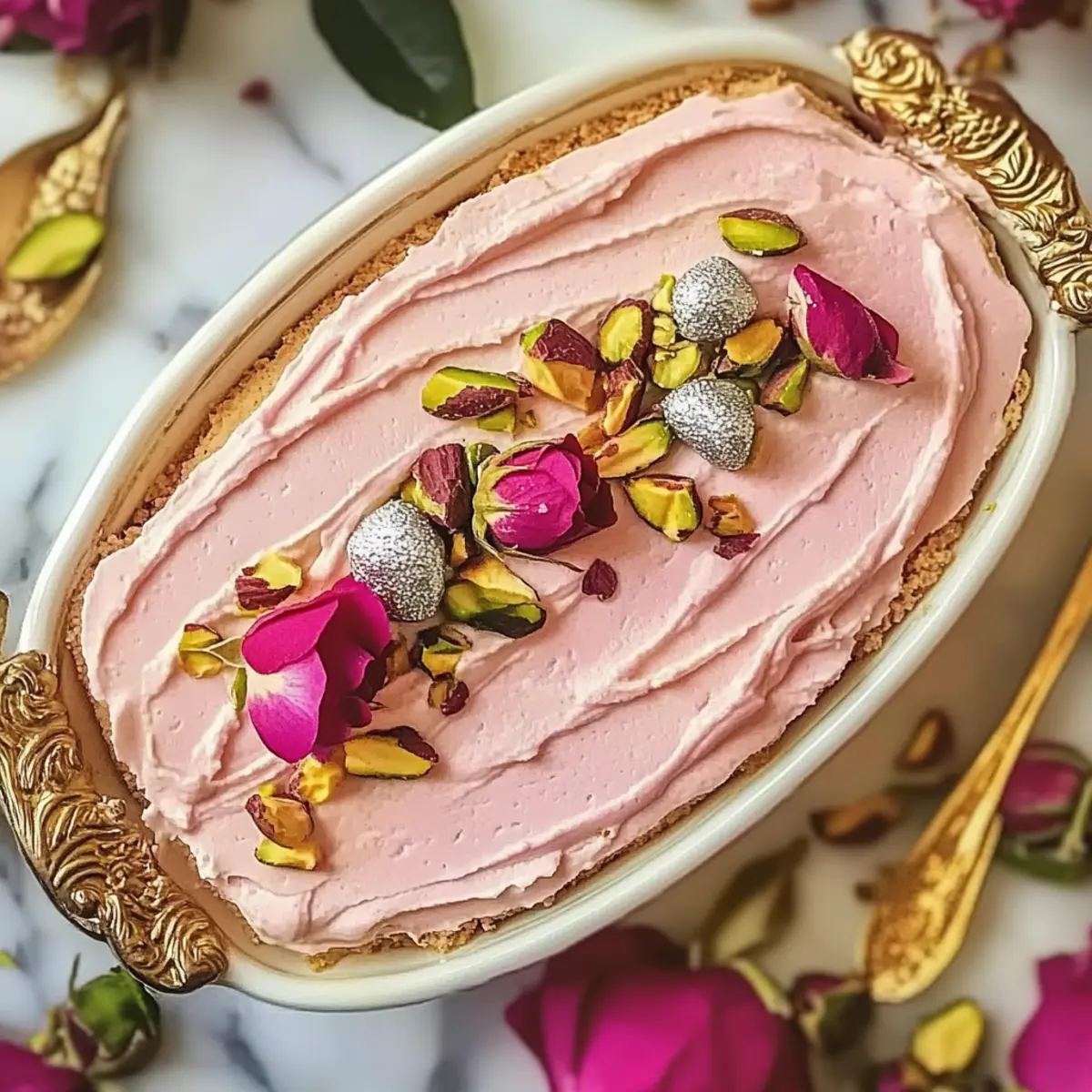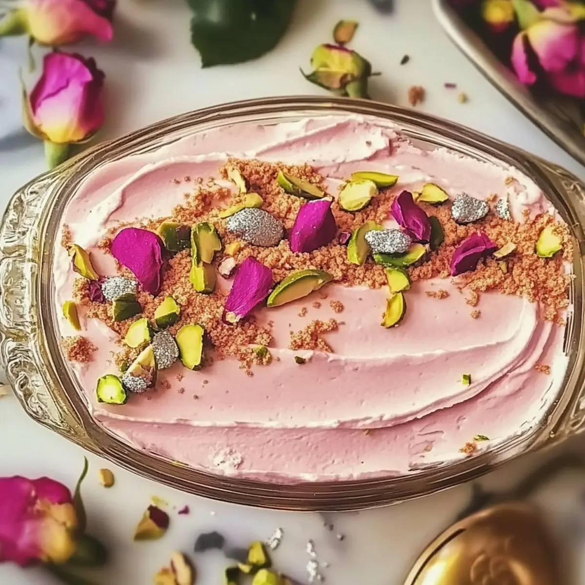 - Once chilled, remove from the fridge, and optionally pipe whipped cream on top, sprinkling with rose buds and pistachios before serving.