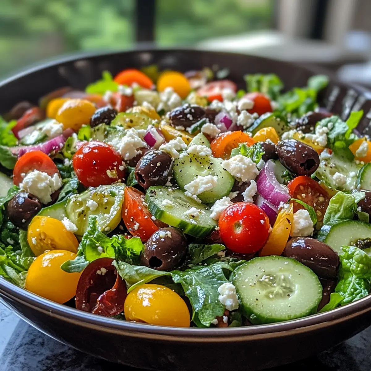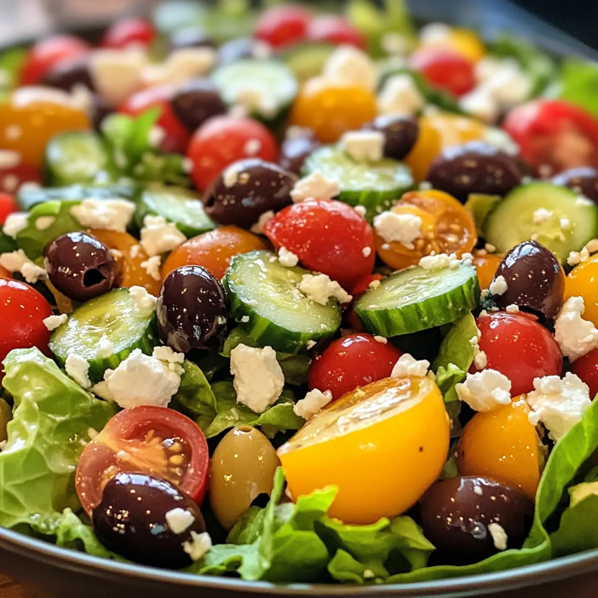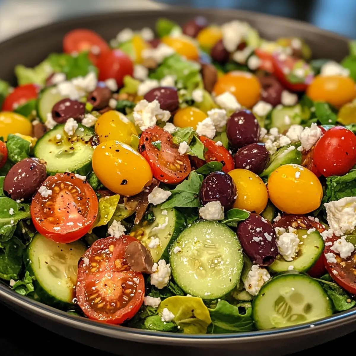- In a large mixing bowl, combine the chopped greens, cucumber, tomatoes, sliced onion, olives, and feta; gently toss together.