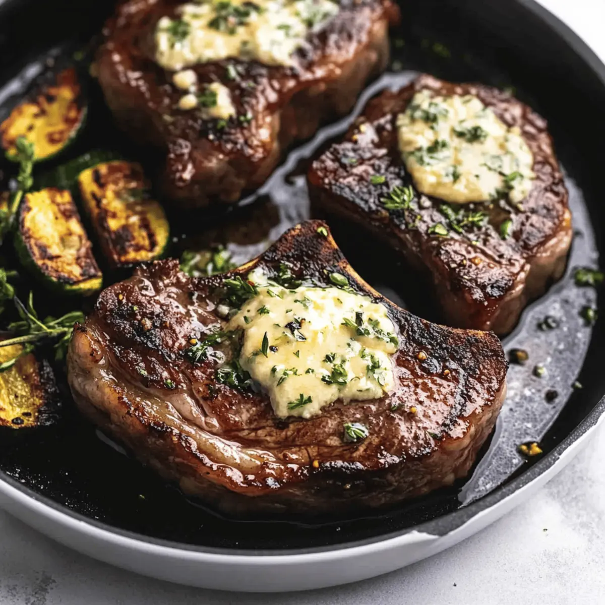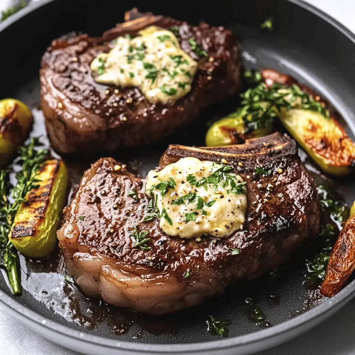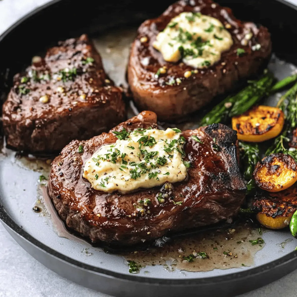 After cooking, transfer the steaks to a cutting board and let them rest for at least 5 minutes. This resting period allows the juices to redistribute within the meat, ensuring a tender bite. Once rested, generously top each steak with the prepared garlic herb butter, letting it melt beautifully over the warm meat before serving.