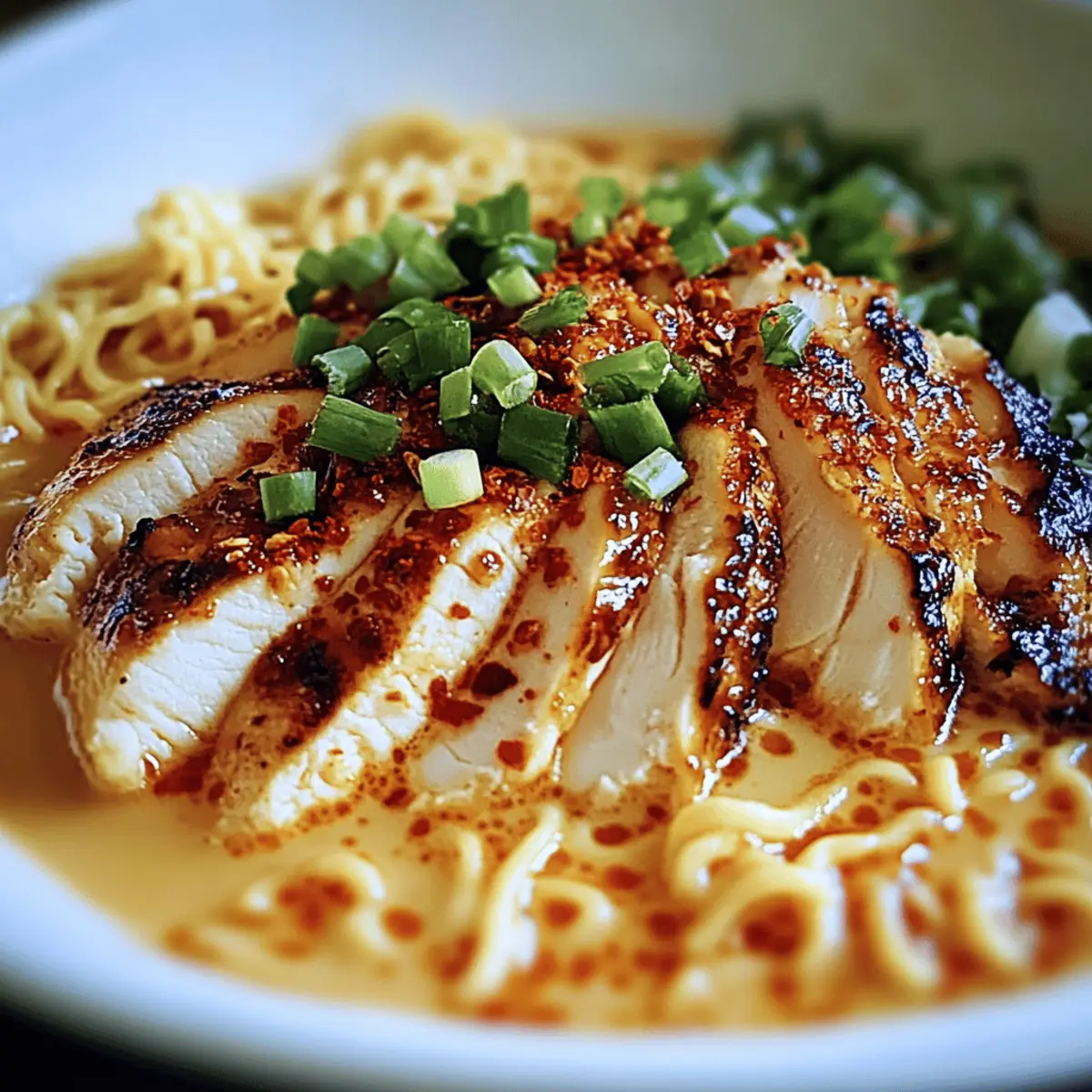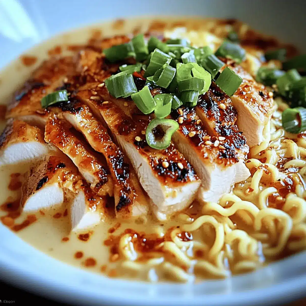 - Slice the rested chicken and arrange it atop the creamy ramen. Garnish with chopped green onions and cilantro.