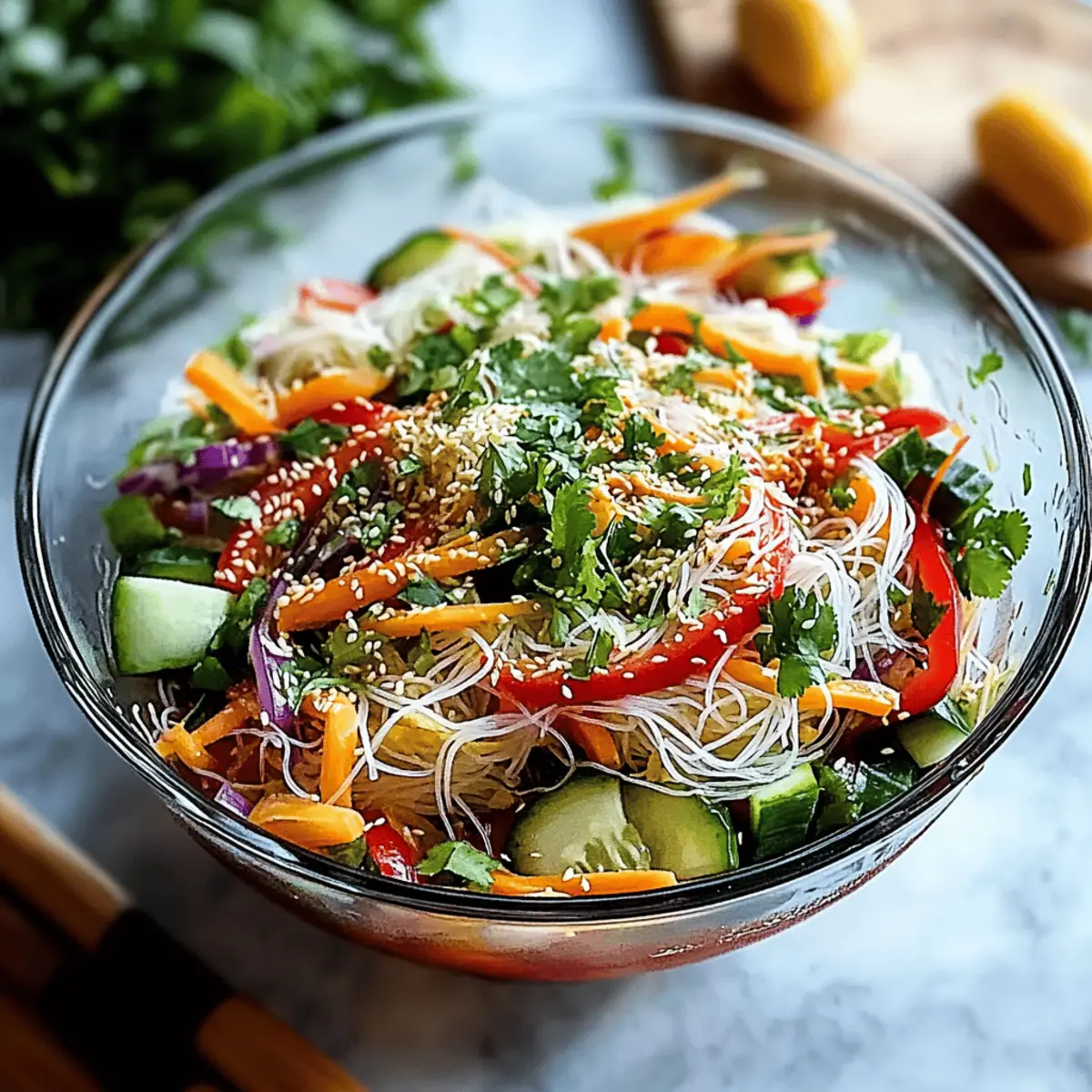 While the noodles cool, prepare your vegetables. Thinly slice the bell peppers and cucumber to showcase their vibrant colors. Shred the carrots into fine strips for that satisfying crunch, and chop fresh cilantro and mint for their aromatic qualities. Set all these beautiful ingredients aside, ready to combine into your refreshing salad.