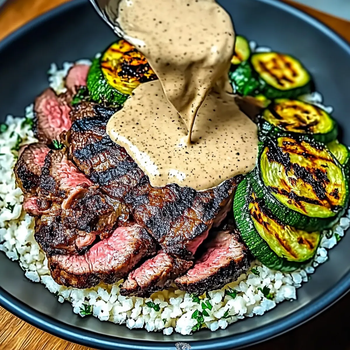 Savory Steak Bowl with Creamy Sauce & Grilled Zucchini Bliss