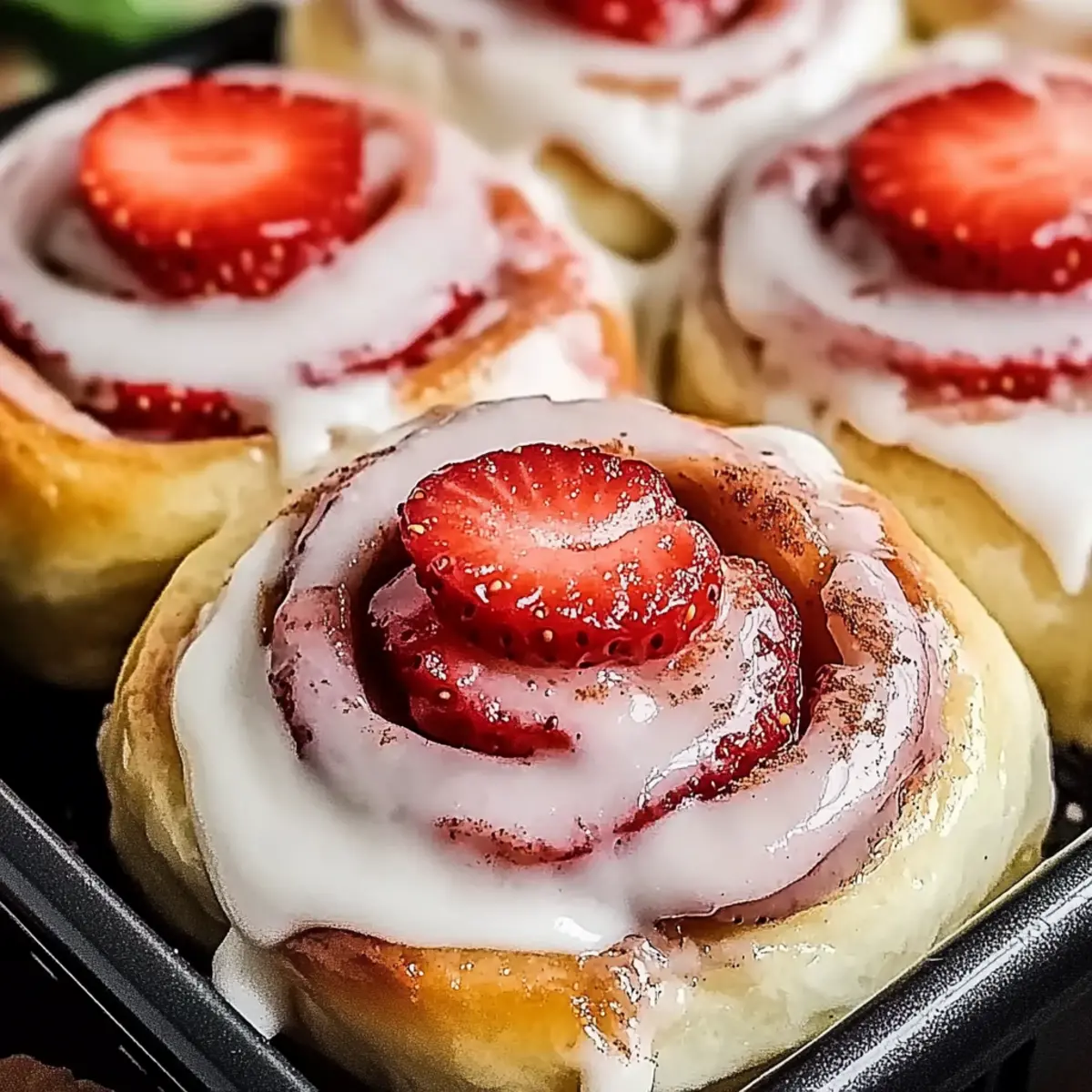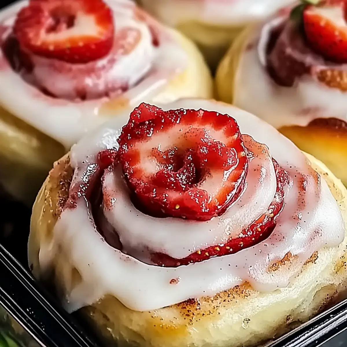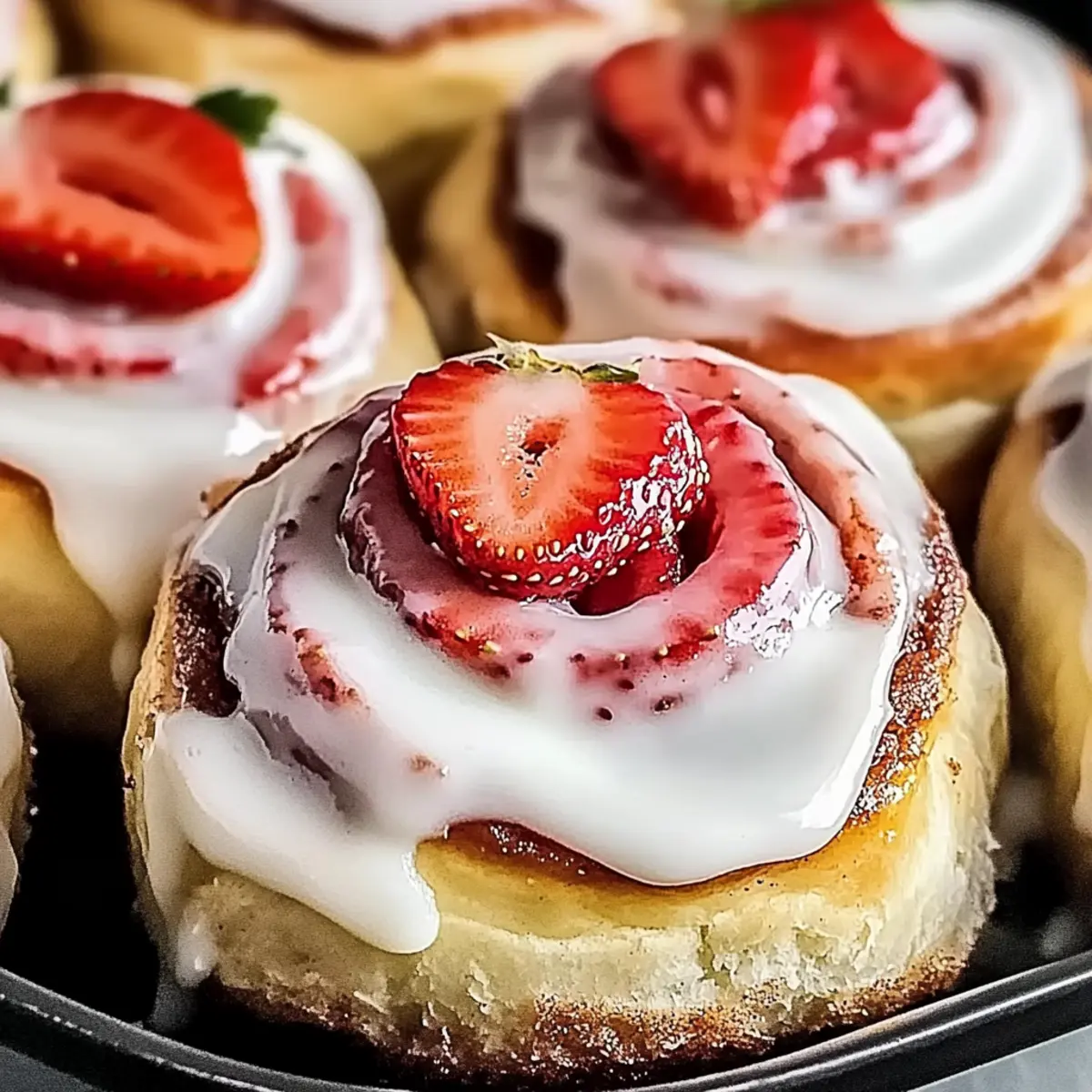 - Drizzle cream cheese icing over warm rolls and garnish with sliced fresh strawberries before serving.