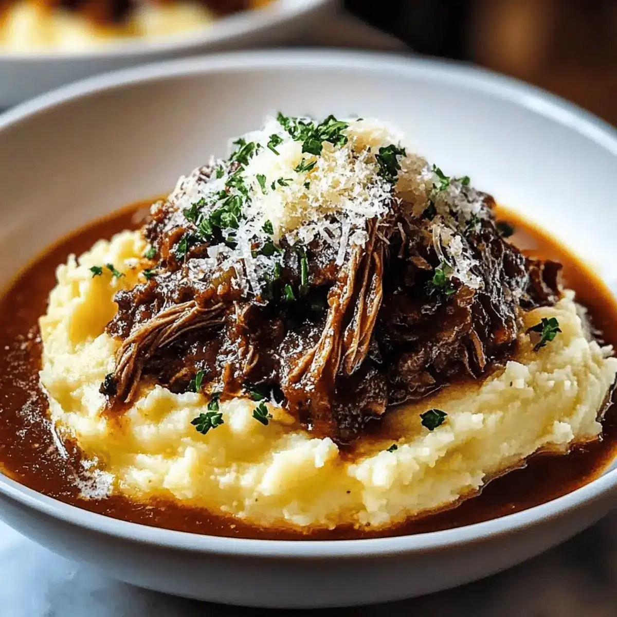 - To serve, spoon a generous portion of the creamy Parmesan mashed potatoes onto each plate. Top them with the savory, tender short rib ragu, optionally garnished with chopped parsley before serving.