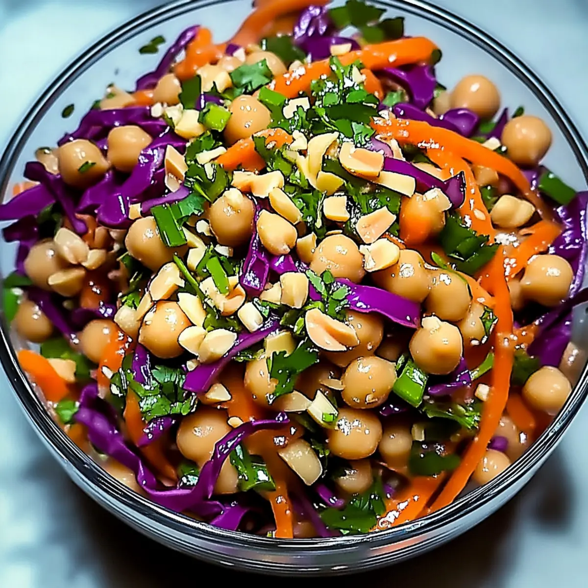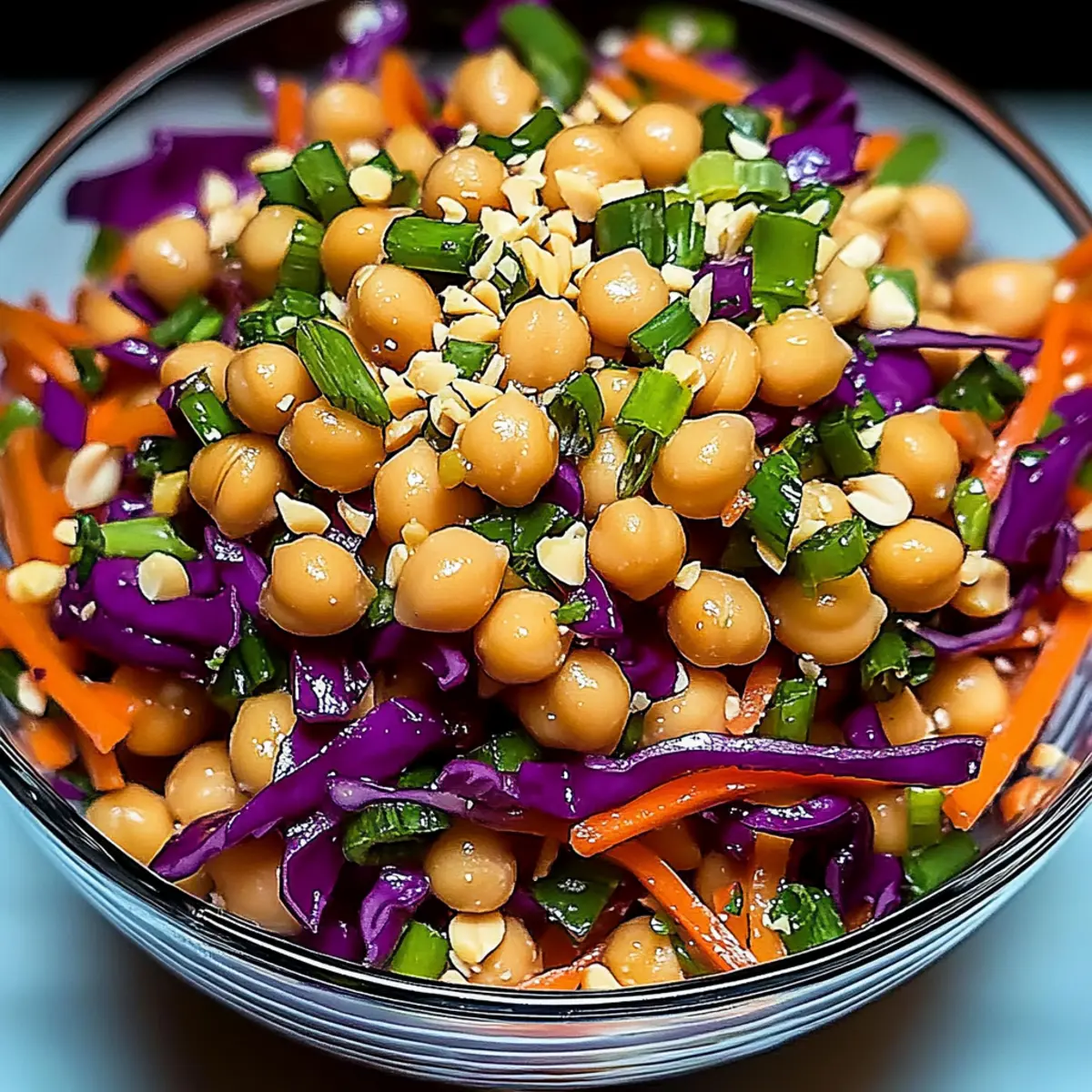 Sprinkle chopped peanuts, fresh cilantro, and a tablespoon of sesame seeds over the top of the salad. Lightly toss the salad again to integrate the toppings, adding extra texture and flavor. These toppings enhance not only the taste but also the presentation of your delicious Thai Chickpea Salad.