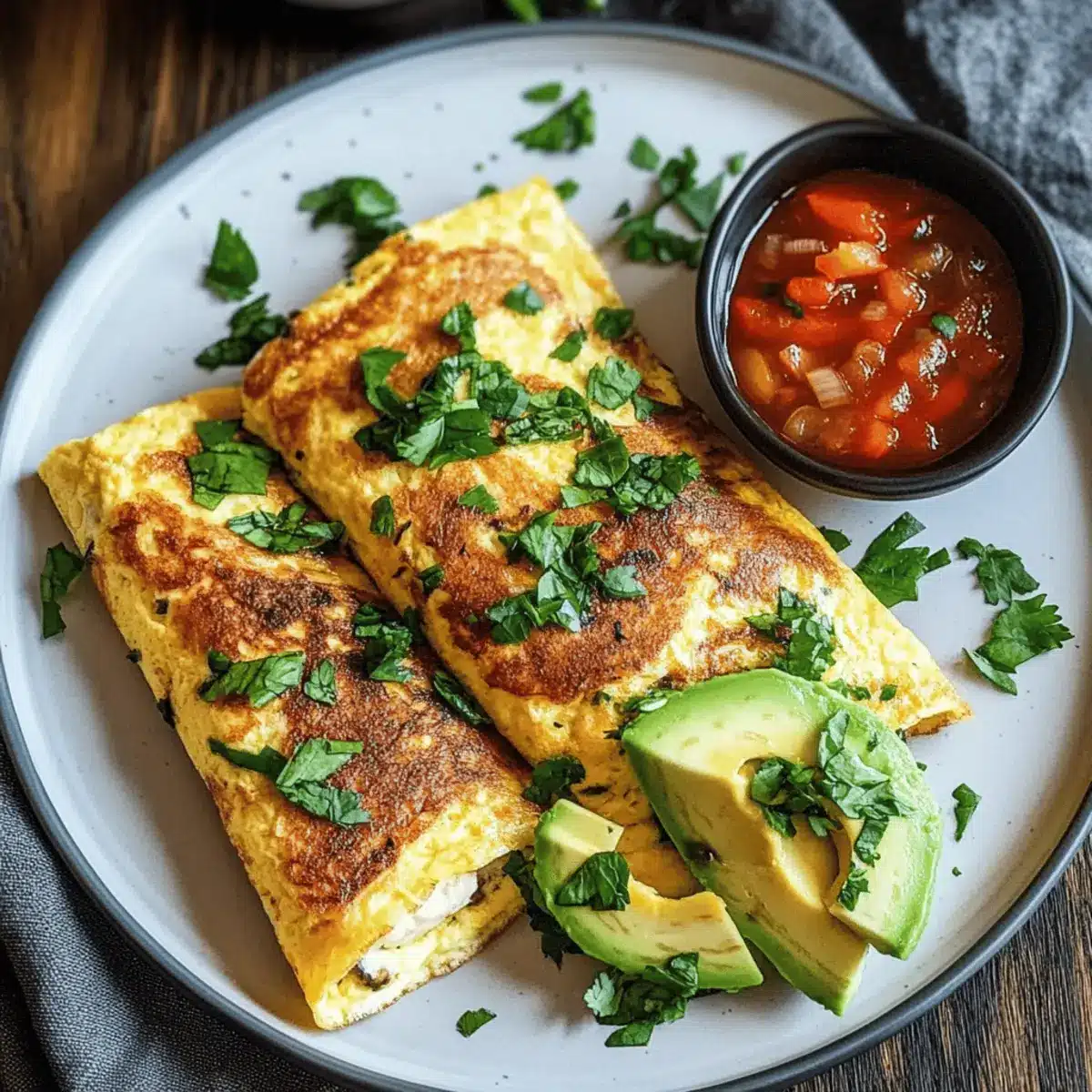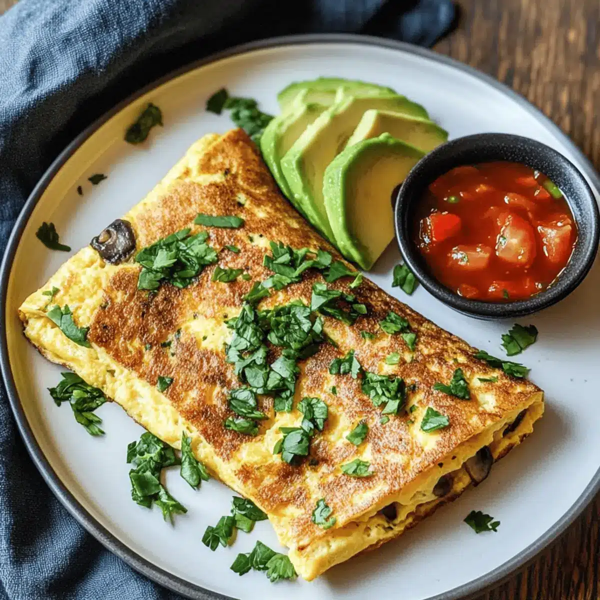 Once the cheese has melted, carefully fold the omelette in half using a spatula, allowing all the delicious ingredients to meld together. Plate the tofu omelette and serve warm, adding optional toppings like avocado slices or hot sauce for a delightful twist. Enjoy this colorful and nutritious meal tailored for your preferences!