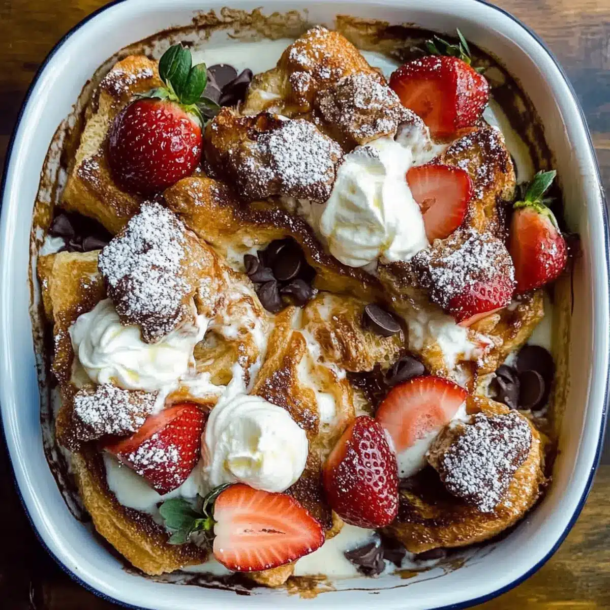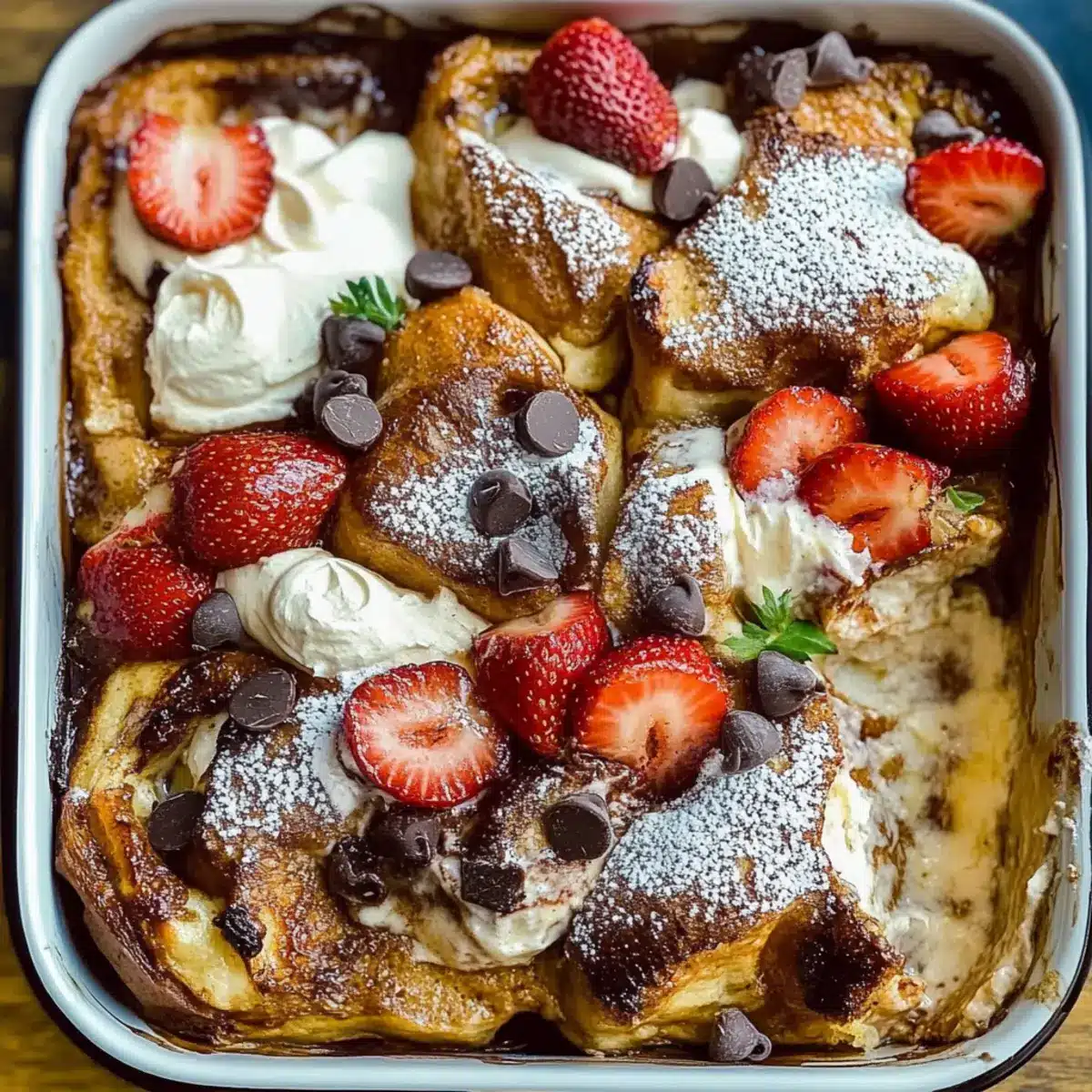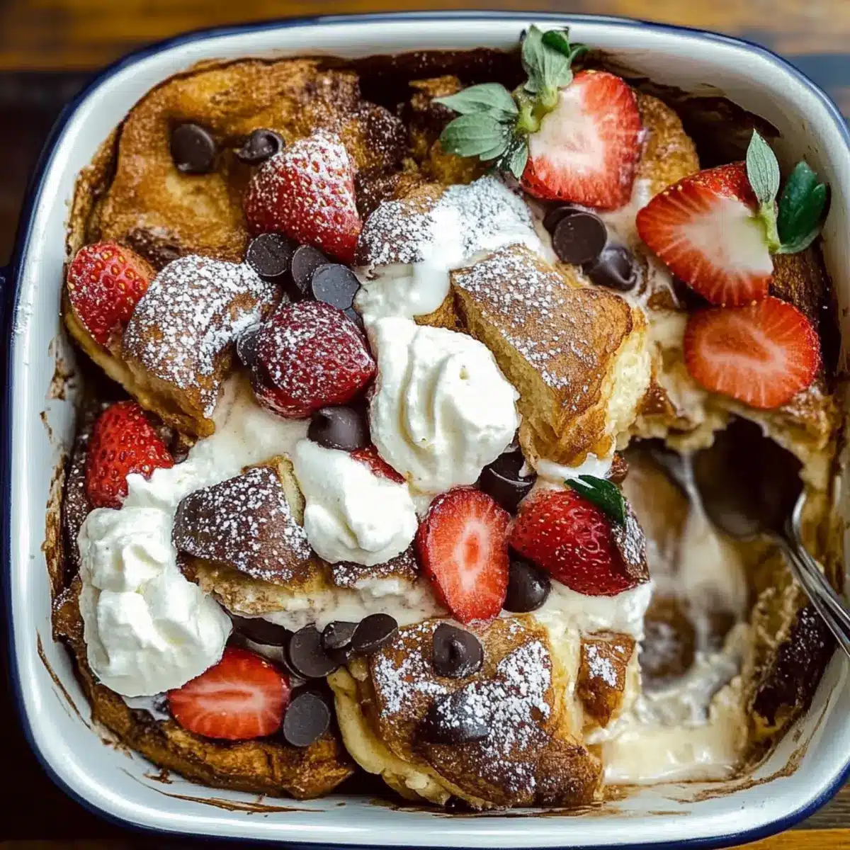 Once baked, remove the casserole from the oven and let it rest for a few minutes. Dust the top with powdered sugar and serve warm, garnishing with whipped cream and the remaining macerated strawberries. This indulgent Tres Leches French Toast Casserole is now ready to delight your family and friends!