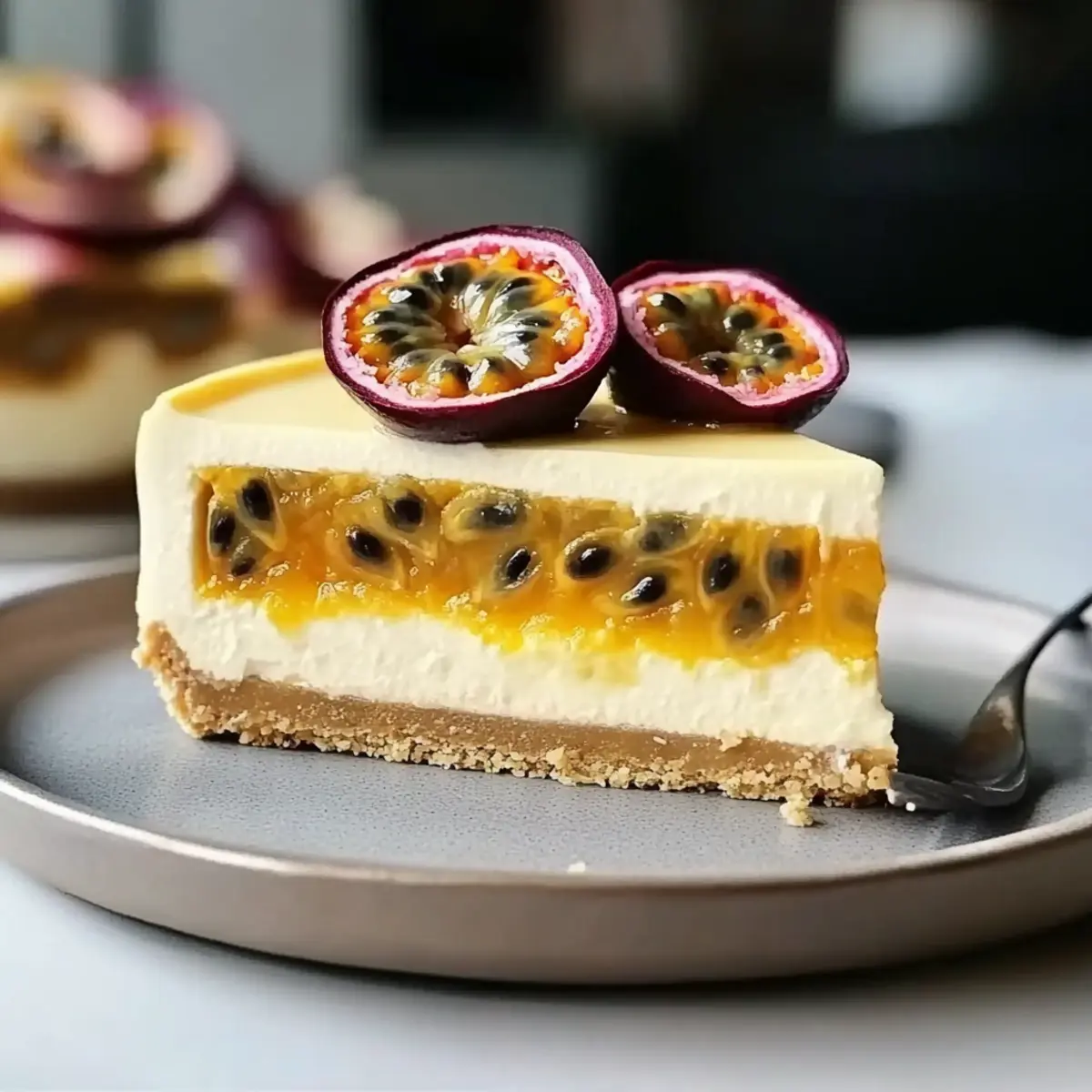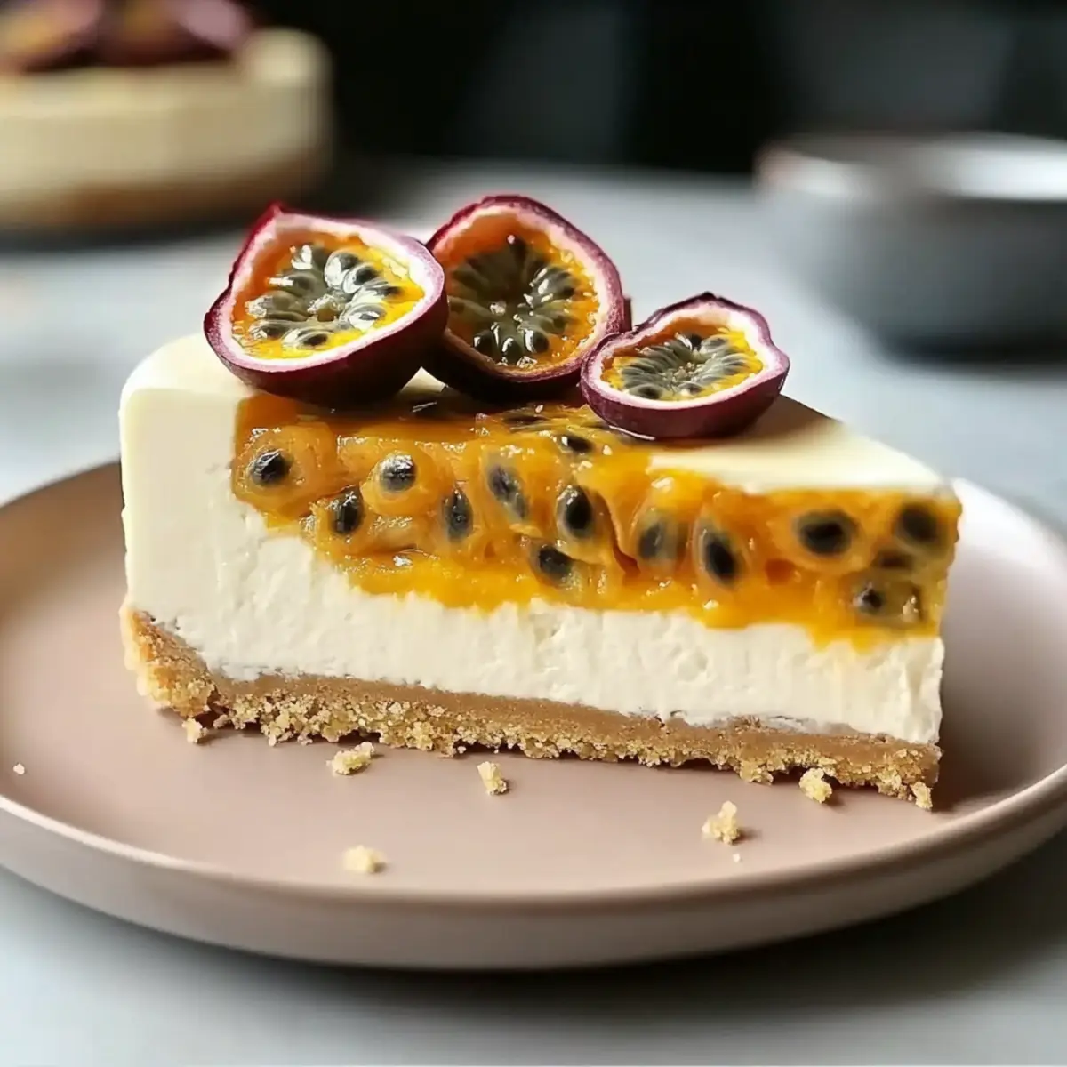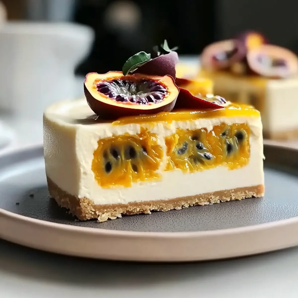 - Drizzle additional passion fruit puree over the cheesecake before serving and sprinkle fresh passion fruit seeds as garnish.